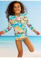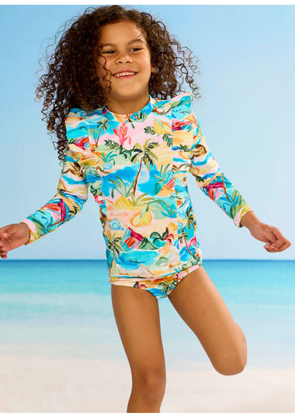 Embrace the joy of summer with Seafolly's Kids playful swimwear. Our bold print designs are perfect for those beach days and poolside adventures. Equally at home in water or building sandcastles. Seafolly Kids swimwear adds that extra touch of style for every summer outing. Isla Palm Frill Paddle suit - Seafolly Girls one piece long sleeve paddle suit with frill details, back zip opening with zip guard at neck, fully lined. Lycra xtra life, UPF 50+ Sun Protection rating, Fully lined brief, Gathered frills on rashie top, Seafolly pip, Matching mini me South pacific print , Designed in Australia Main: 80% Polyester 20% Elastane, Lining: 90% polyester 10% Elastane