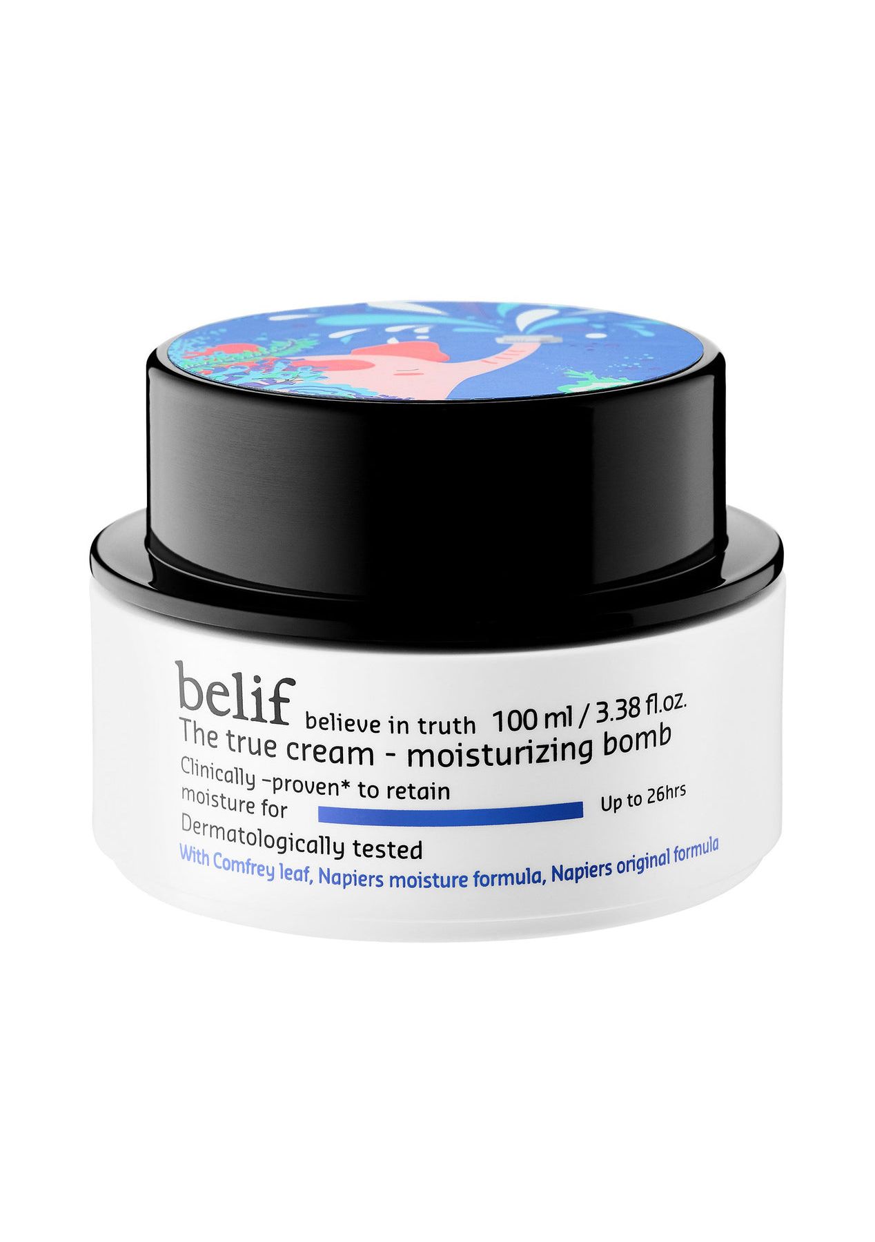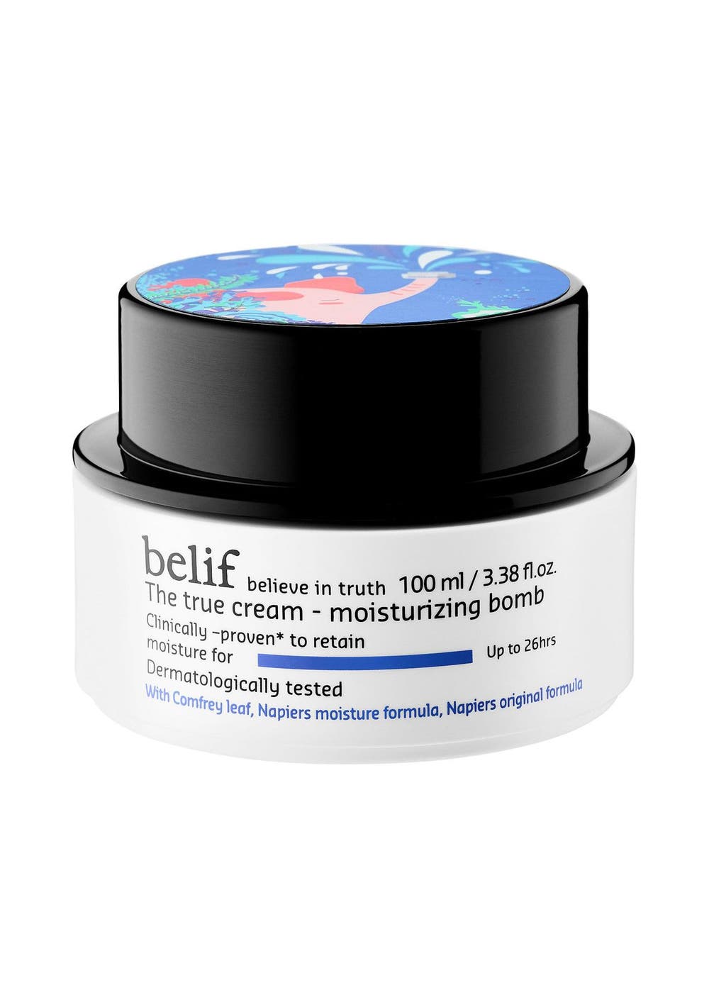 Belif The True Cream Moisturizing Bomb is a rich, nourishing moisturizer designed to provide intense hydration and replenish moisture to the skin. Key features of Belif The True Cream Moisturizing Bomb include: Deep hydration: The Moisturizing Bomb is formulated with a blend of moisturizing ingredients, such as Comfrey Leaf, Ceramide 3, and Glycerin, to deliver deep and long-lasting hydration to the skin. It helps to replenish and retain moisture, leaving the skin plump and supple. Nourishing and comforting: The rich texture of the Moisturizing Bomb provides a comforting and soothing feel on the skin. It helps to nourish and strengthen the skin's barrier, enhancing its resilience and protecting it from moisture loss. Suitable for dry and dehydrated skin: The Moisturizing Bomb is particularly beneficial for individuals with dry or dehydrated skin, as it provides the essential moisture and hydration that these skin types often lack. It helps to relieve dryness, roughness, and tightness, restoring a smoother and more balanced complexion. To use Belif The True Cream Moisturizing Bomb, take a small amount of the product and gently massage it onto clean skin, focusing on the face and neck. It can be used both morning and night as part of your skincare routine, following cleansing and toning.
