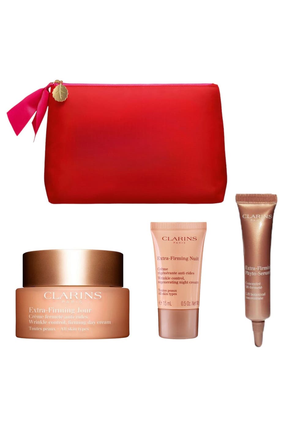 Featuring our best-selling Extra-Firming Day and Nigh Creams for all skin types and our cult-classic Extra-Firming Phyto-Serum to revitalise and intensely nourish skin. This collection contains:- Extra-Firming Day Cream - All Skin Types, 50ml. - Extra-Firming Night Cream - All Skin Types, 15ml.- Extra-Firming Phyto-Serum, 15ml.- All presented in a Clarins beauty bag.