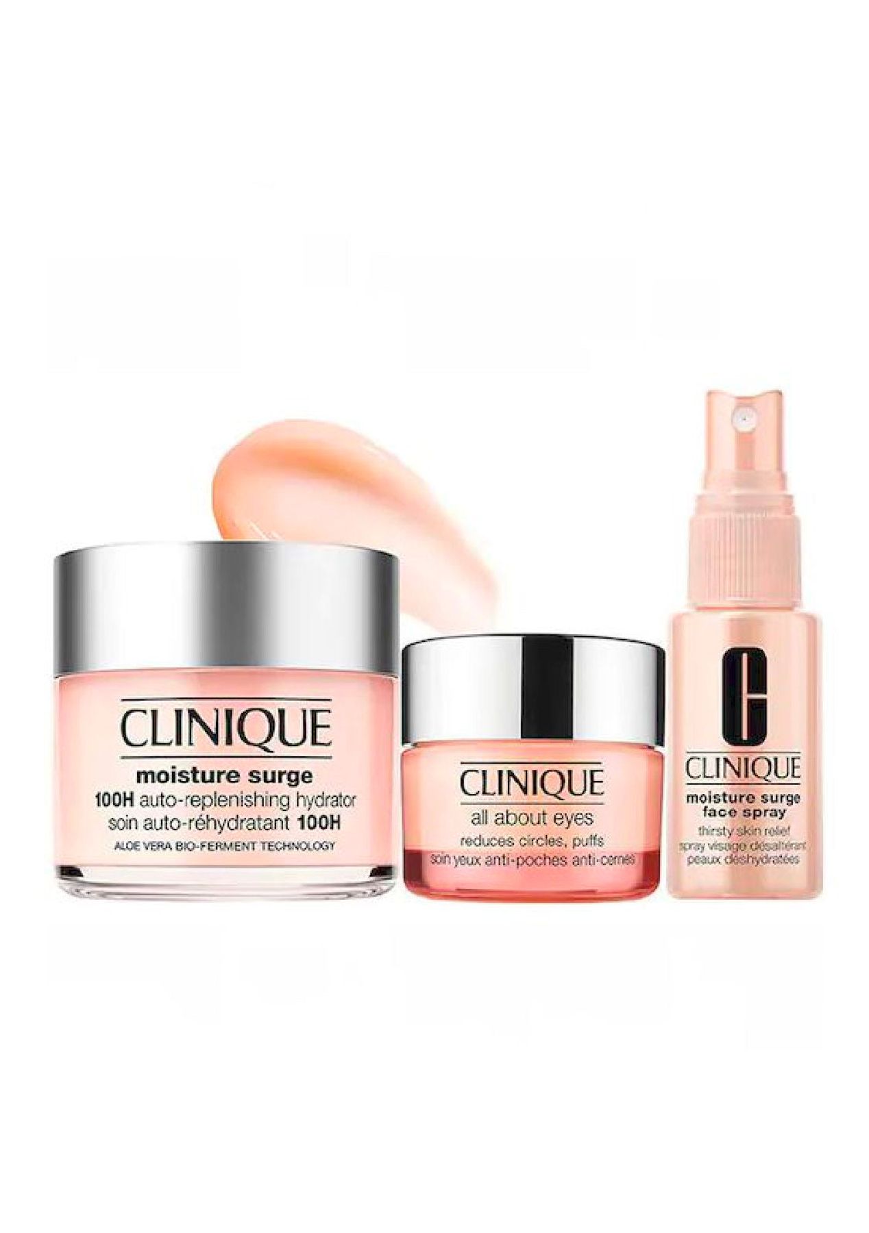 Clinique Moisture Surge 100 Hour Auto-Replenishing Hydrator 125mlAn upgrade on our refreshing fan-favourite, this oil-free gel-cream moisturiser with exclusive aloe bio-ferment and hyaluronic acid penetrates deep into skin‚ surface‚Äîfor hydration that goes over 10 layers deep* and lasts for 100 hours, even after washing your face.Lightweight oil-free formula provides hydration that goes over 10 layers deep.* Delivers a 174% immediate moisture boost** and keeps skin hydrated for 100 hours. Advanced hydrator with Auto-Replenishing Technology helps skin create its own internal water source to continually rehydrate itself, then locks in moisture for an endlessly plump, healthy-looking glow.How to use:Apply morning and night to clean skinUse on dry areas like cuticles and elbows for an extra hydrating boostClinique Moisture Surge Face Spray 30mlRefreshing, oil-free face spray rapidly replenishes skin's moisture level with a fine mist.- Bursting with moisture and activated aloe water, this must-have oil-free face spray immediately hydrates, softening and soothing skin in a flash. The antioxidant-enriched formula helps neutralize environmental aggressors. Portable size means you can enjoy an instant spritz of refreshing moisture anytime.How to Use- Hold 10-12" from the face. Close eyes and spray a light mist.- Use in addition to daily moisturizer, under or over makeup, whenever skin feels thirsty.- Avoid spraying into eyes.All About Eyes 15mlThis lightweight eye cream diminishes the appearance of puffs, undereye circles. Non-creep, cream/gel formula actually helps hold eye makeup in place. Ophthalmologist tested.How to Use- Use twice a day, morning and night.- Prep skin for optimal results with your 3-Step Skin Care routine.- With ring finger, apply sparingly to entire eye area using a gentle patting motion. Clinique Moisture Surge Ultra 100 Hour Hydration Set pack contents: Moisture Surge 100 Hour -Hour Auto-Replenishing Hydrator 125mLMoisture Surge Face Spray Thirsty Skin Relief 30mL All About Eyes 15mL
