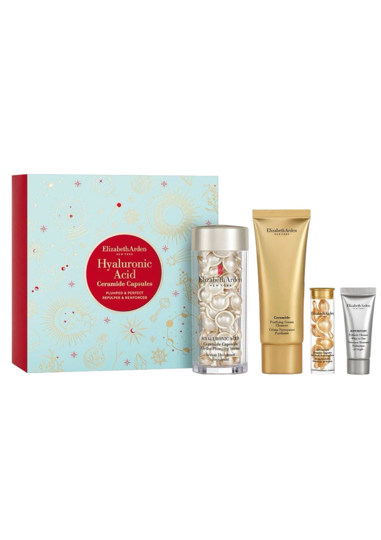 The Elizabeth Arden Hyaluronic Acid Ceramide Capsules 60 Piece Set contains:Hyaluronic Acid Ceramide Capsules 60 pieceAdvanced Ceramide Capsules 7 pieceCeramide Purifying Cream Cleanser 50mlSUPERSTART Skin Renewal Booster 5ml