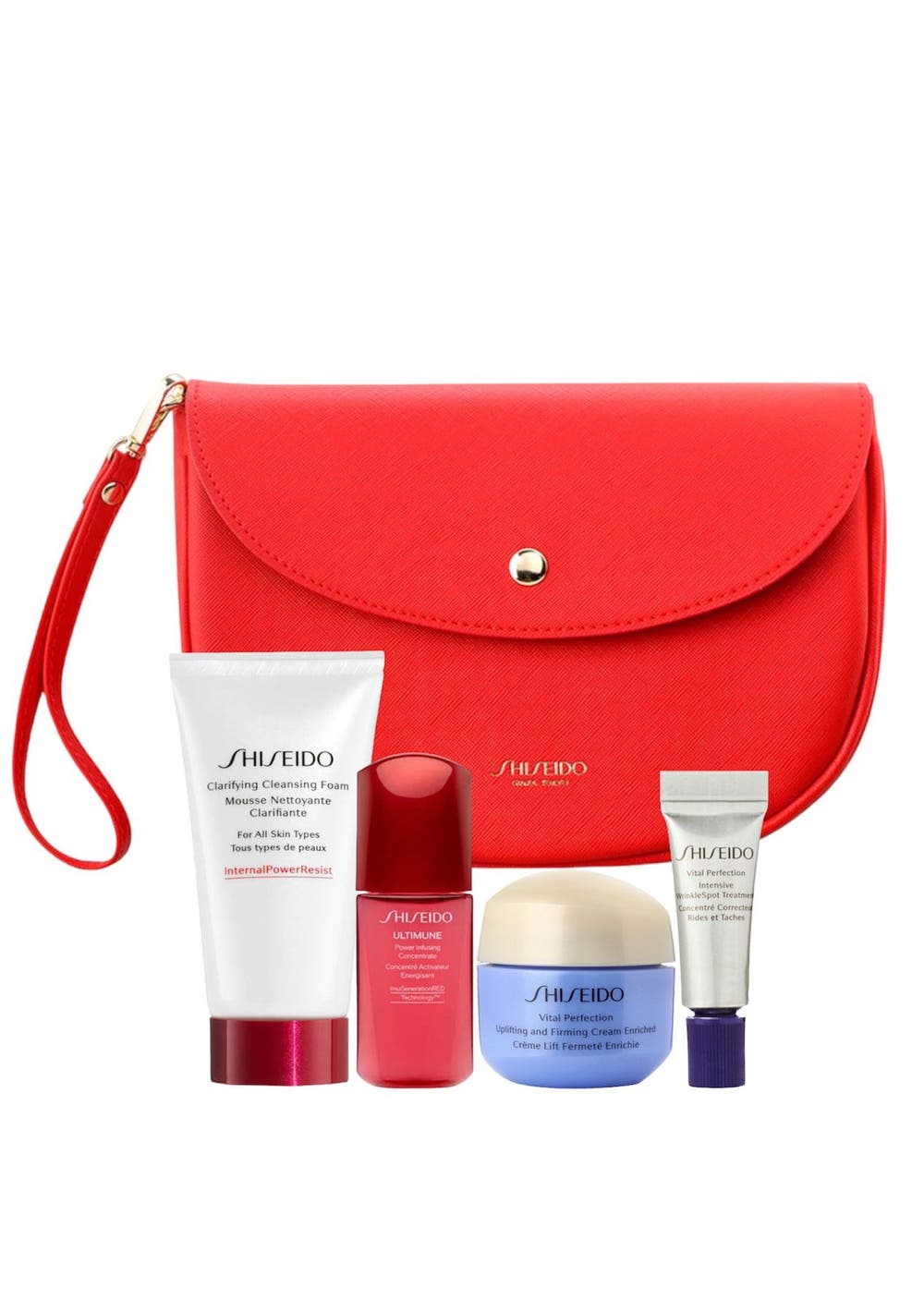 Contents Shiseido Ultimune power infusing concentrate RED 10ml Shiseido Vital-Perfection Uplifting and Firming Cream 15ml Shiseido Clarifying Cleansing Foam 50ml Shiseido Vital Perfection Intensive Wrinklespot Treatment 2ml Shiseido Red Cosmetics Handbag Shiseido Ultimune power infusing concentrate RED 10ml Ultimune is an antioxidant powerhouse that strengthens skin against daily damage and visible signs of aging. It‚ a universal-use serum for all skin types and skin tones. Ultimune is your do-everything-better serum, amplifying the effects of any skincare regimen. Devotees call it ‚Äúa game changer,‚Äù for ‚Äúrestoring firmness,‚Äù ‚Äúreducing visible redness,‚Äù ‚Äúminimizing pores,‚Äù and ‚Äúleaving skin looking plump, radiant and youthful.‚Äù Ultimune hydrates and defends skin against the effects of stress, pollution, and urban life. Powered by antioxidant Reishi Mushroom and Iris Root Extract, this concentrated daily treatment fends off free radicals shielding complexions from the oxidative distress that leads to premature aging. Our exclusive ImuGeneration Technology‚fortifies skin, helping it to help itself. HOW TO Dispense two pumps of serum into palms then smooth over the face. Use every morning and evening, after cleanser and before moisturizer. Apply on its own or layer other targeted serums over top. Quickly dries to a silky finish that won‚Äôt disrupt makeup application Shiseido Vital-Perfection Uplifting and Firming Cream 15ml Support skin‚ ability to self-regenerate with ReNeura Technology‚Ñ¢. Reach new levels of firmness with KURENAI-TruLift Complex‚Ñ¢, producing collagen, elastin and hyaluronic acid. Reawaken skin‚ potential and counteract the visible signs of aging: loss of elasticity, wrinkles and dark spots. Reveals a firmer, lifted, more even and radiant look. Shiseido Clarifying Cleansing Foam 50ml This cleanser contains Micro White Powder and white clay to effectively remove impurities. Rich. Foamy. Removes skin-dulling surface cells, pollutants and oxidized substances that can cause the look of aging. Made with deeply hydrating ingredients so it won't strip away skin's essential moisture, enhancing its inner defenses. Great for all skin types. Shiseido Vital Perfection Intensive Wrinklespot Treatment 2ml The highly effective Intensive WrinkleSpot Treatment is a breakthrough cream formula developed to reduce the appearance of age-related concerns, such as deep wrinkles, dark spots and loss of firmness, and address them with key ingredients and technology. How to use Enhance Results With These Application Techniques Apply every morning and night. A pearl-sized amount works for the entire face. Dab cream under eyes and on crow‚ feet. Using the pads of middle and ring fingers, gently spread from the inner corner of the eye outward. While gently stretching the skin by the corner of the eye with one hand, blend the cream into skin, moving fingers up and down. Dab cream on nasolabial folds or wrinkles around mouth. Using the pads of middle and ring fingers, gently blend the cream into skin, spreading it on both sides of the face. Dab cream onto dark spots and, with your middle finger, smooth into skin using circular motions. Use another pearl-sized amount for the neck. Lift chin slightly, to gently stretch the neck and smooth wrinkles. Apply the cream to wrinkles you want to treat. Using your right hand for the left side of the neck, and your left hand for the right side, gently blend the cream into the skin while moving fingers upward. Shiseido Red Cosmetic Handbag Height - 16cmLength - 22cm