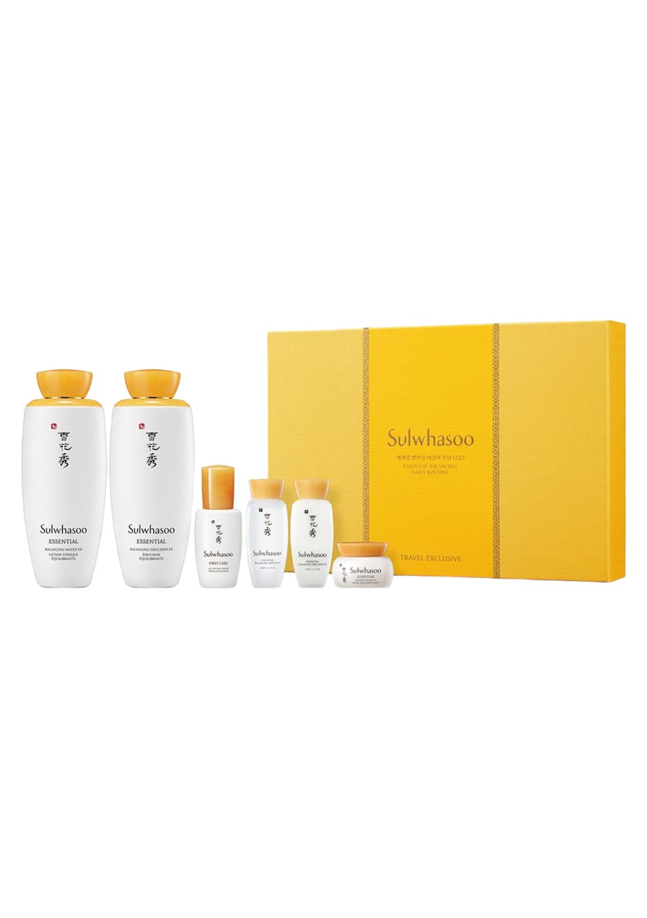 The set includes:Essential Balancing Water EX (125ml 15ml)Jelly-like nourishing water can be quickly absorbed, bringing in a deep moisturizing beauty effect, instantly filled with moisture and nourishing, leaving skin soft and soft.Deep Moisturizing: Contains purslane extract and medicinal Polygonatum rhizome extract to moisturize and improve skin dehydration.Soothing and softening skin: gel-like skin lotion, with soothing paeonia extract, the skin is fresh and comfortable after use, and becomes moist and soft.Brighten skin tone: Lotus extract and Rehmannia glutinosa extract help improve dull skin tone. How to use:After using the essence in the morning and evening, take an appropriate amount on the palm and apply evenly on the entire face.Essential Balancing Emulsion EX (125ml 15ml)Micro-textured nourishing lotion, with excellent moisturizing effect, can quickly inject moisture and nutrients into the skin, and regain the smooth and tender skin.Deep Moisturizing: Contains purslane extract and medicinal Polygonatum rhizome extract to moisturize and improve skin dehydration.Soothing and softening skin: gel-like skin lotion, with soothing paeonia extract, the skin is fresh and comfortable after use, and becomes moist and soft.Brighten skin tone: Lotus extract and Rehmannia glutinosa extract help improve dull skin tone.How to use:After using toner in the morning and evening, take an appropriate amount on the palm, and apply it evenly and evenly to the entire face.First Care Activating Serum (8ml)The moisturizing essence contains the core ingredient of the brand, Ziyin Dan ‚Ñ¢, which can greatly enhance the repairing effect of subsequent skin care products.Revitalizing your skin in all directions is an important first step in your skincare routine.Extra skin care effect: Use after cleansing your face, it can first reconcile the skin to the ideal balance, and double the penetration and repair effect of subsequent skin care products.Moisturizing and moisturizing: Lily extract and Polygonatum extract can moisturize and moisturize the skin, and relieve dehydration.Firming and Brightening: Rehmannia glutinosa extract and peony extract make skin firmer and smoother, improving dullness.How to use: After cleansing your face in the morning and evening, take 2 to 3 pumps on the palm, apply with fingertips to the entire face, and then wrap your face with both hands to enhance the absorption effect.Essential Firming Cream EX (5ml)This high-efficiency firming cream restores skin elasticity from the inside out and deeply moisturizes the skin.Contains JISUN Firming Complex ‚Ñ¢, including wolfberry, black beans, and kudzu root, to strengthen the skin and increase its support.Skin becomes healthier, firmer and stronger after use.How to use: After using the eye cream in the morning and evening, take an appropriate amount and gently apply it to the face and neck along the skin texture.