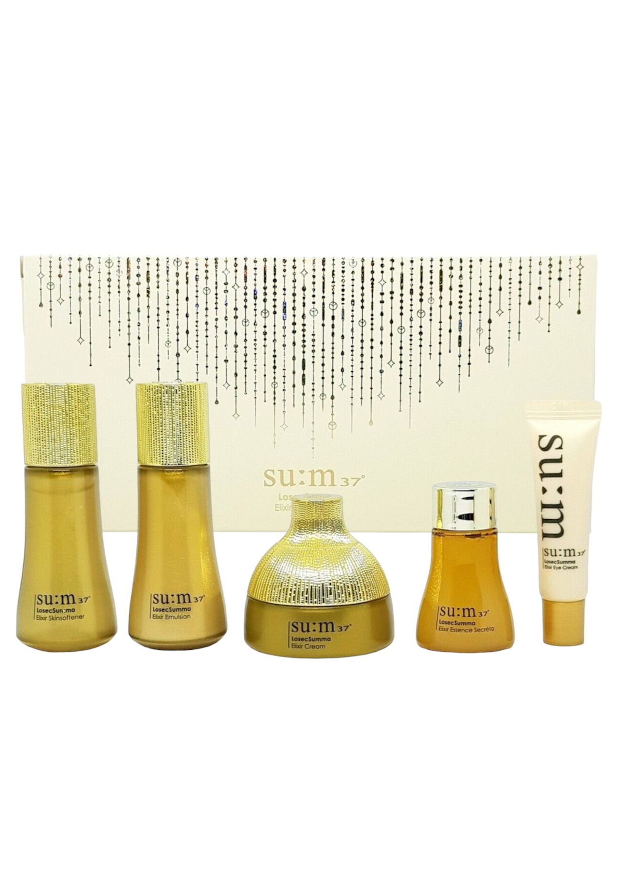 Product Description1. LosecSumma Elixir Skin Softener 20ml2. LosecSumma Elixir Emulsion 20ml3. LosecSumma Elixir Essence Secreta 12ml4. LosecSumma Elixir Eye Cream 6ml5. LosecSumma Elixir Cream 10mlSu:m37 LosecSumma Elixir Skin Softener 20mlA soft and non-sticky jelly-like texture, this anti-aging toner is easily absorbed.Core Cytosis®, Ferm-TheriacaTM and Ferm Arishta GoldTM ingredient, to smooth fine lines and purify the skin, enhancing skin self-regeneration.Creates a light moisturizing layer on the skin to provide and retain moisture in skin.Does not contain synthetic fragrance.Su:m37 LosecSumma Elixir Emulsion 20mlA highly nourishing anti-aging emulsion with Lactobacillus ferment, Turmeric and Betaine, enhances the moisturizing effect and strengthens the skin barrier, calms and soothes sensitive skin.The use of Core Cytosis®, Ferm-TheriacaTM and Ferm Arishta GoldTM ingredient, to lighten fine lines and purify the skin.Soft, smooth texture with high spreading ability, it creates a long-lasting moisturizing protection layer on skin for a naturally radiant complexion.Does not contain synthetic fragrance.Su:m37 LosecSumma Elixir Essence Secreta 12mlA high performing anti-aging essence, rich in Golden ElixirTM with strong skin recovering properties.Thanks to the strengthened formulation, Advanced Golden FormulaTM, together with Cytosis®, it minimizes fine lines, enhances the formation of collagen, assist in repairing skin barrier in order to defend against the impact from external environment and soothe sensitive skin.The use of Double Liposome System technique, facilitates the absorption of core ingredient into the skin under undiluted condition, achieving a more pronounced skin improvement.Does not contain synthetic fragrance.Su:m37 LosecSumma Elixir Eye Cream 6mlAn ultimate regenerating eye cream smooths fine lines and firms around the eyes.With core Cytosis®, Ferm-TheriacaTM and Ferm Arishta GoldTM ingredient, it lightens fine lines around eye areas and facilitates skin self-regeneration with anti-aging properties, restoring the suppleness of eye area.Observable skin improvement after 4 weeks of usage.Does not contain synthetic fragrance.Su:m37 LosecSumma Elixir Cream 10mlAn ultimate regenerating cream.Core Cytosis®, Ferm-TheriacaTM and Ferm Arishta GoldTM ingredient together with Ceramide and Hyaluronic Acid, it improves the skin density and strengthens the skin barrier, facilitates self-regeneration which helps fight against the skin damages caused by external environment.Unique emulsifying technique, transforming the active ingredients into fine particles, enhances skin absorption and does not irritate skin. With addition of adenosine, it protects skin from aging.Creates a moisturizing protection layer, providing skin a long-lasting hydration and radiance and skin looks naturally beautiful.Does not contain synthetic fragrance.