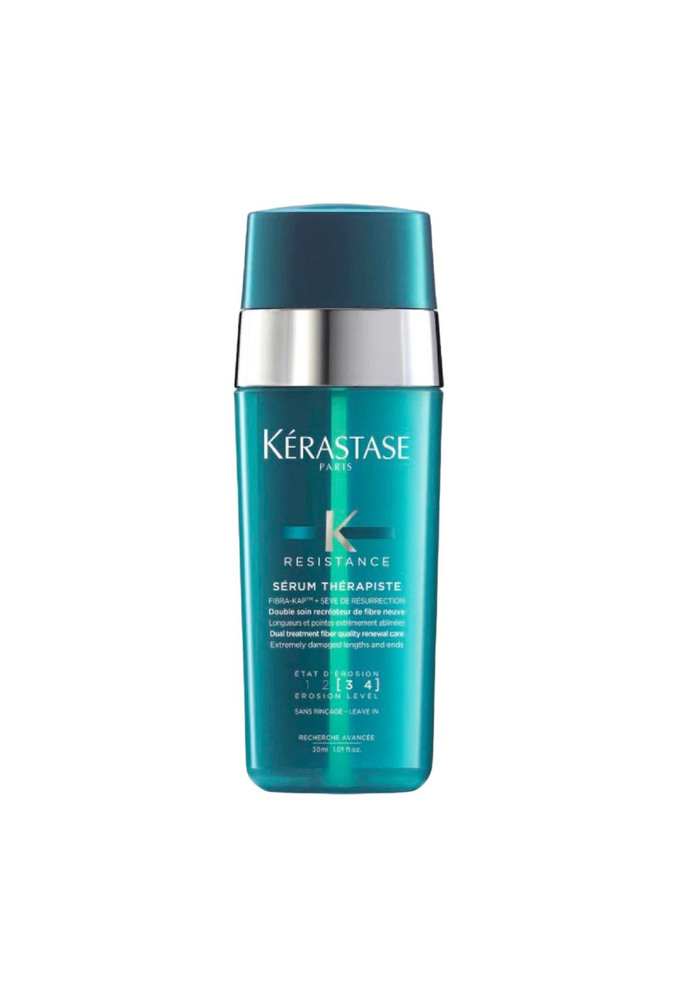 Krastase Resistance Serum Therapiste is a hair serum specifically designed for damaged and over-processed hair. It is part of the Krastase Resistance range, which focuses on repairing and strengthening weakened hair. Krastase Resistance Serum Therapiste is formulated with a combination of powerful ingredients that target damaged hair fibers, providing intense nourishment and repair. Some key features and benefits of Krastase Resistance Serum Therapiste include: Dual Action: The serum has a dual-action formula that helps to repair and protect the hair. It works on both the surface of the hair and the inner structure, providing comprehensive care for damaged strands. Fibra-Kap Technology: This technology combines amino acids, proteins, and ceramides to help reinforce the hair fibers, restore elasticity, and promote overall hair strength. Softens and Smooths: Serum Therapiste has a silky texture that helps to smooth the hair cuticles, reducing frizz and improving manageability. It leaves the hair feeling soft, shiny, and healthy. Heat Protection: The serum provides heat protection, shielding the hair from damage caused by heat styling tools such as blow dryers, straighteners, and curling irons. Seals Split Ends: By sealing the damaged ends of the hair, Serum Therapiste helps to prevent further splitting and breakage, giving the hair a healthier appearance. To use Krastase Resistance Serum Therapiste, apply a small amount of the serum to towel-dried or dry hair, focusing on the lengths and ends. Gently massage the product into the hair, ensuring even distribution. Leave it in and style your hair as desired. The serum can be used on a daily basis or as needed.