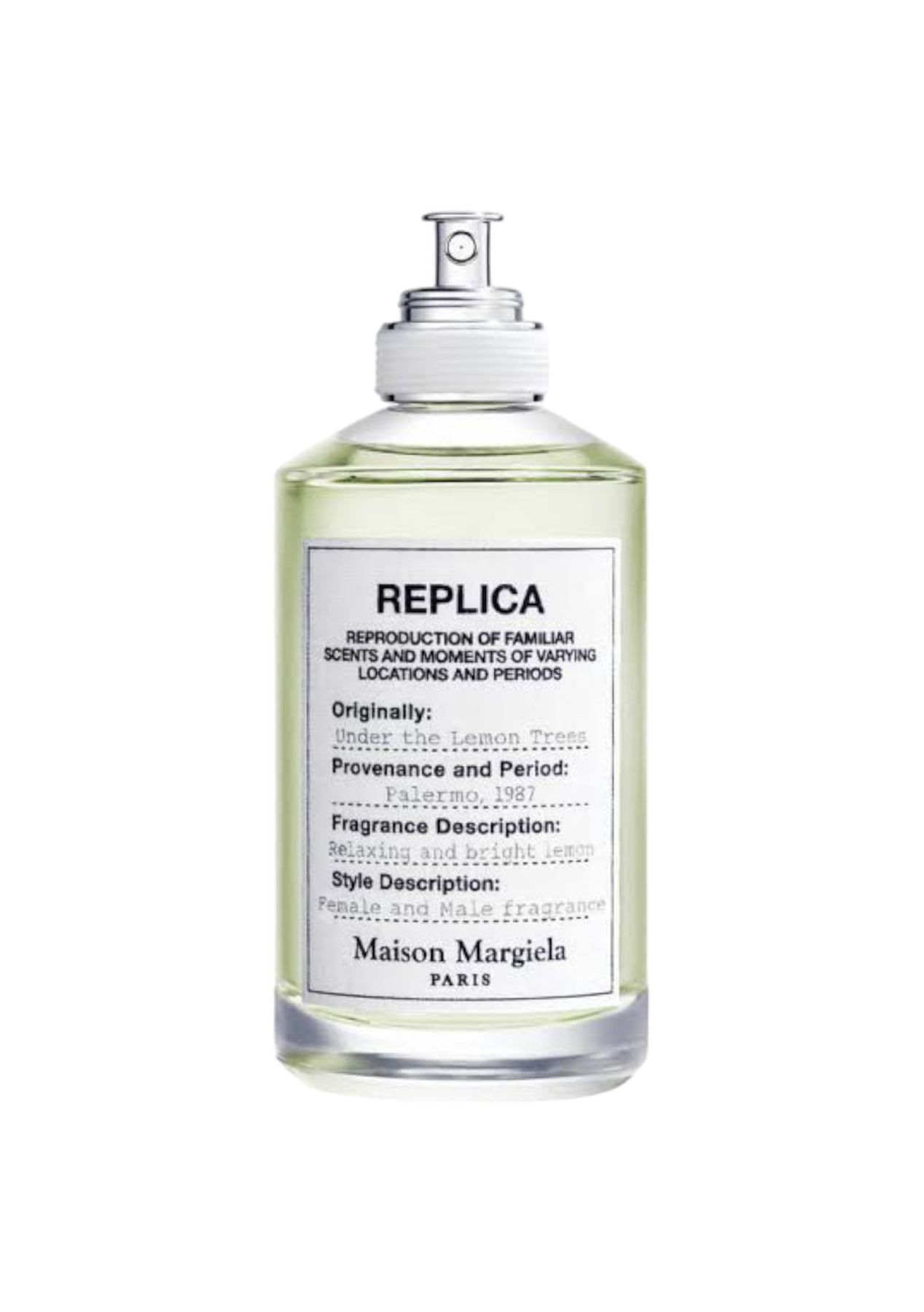 Maison Margiela's Replica Under The Lemon Tree is designed to remember a sunny escape in a field of brightening lemon trees. Under the Lemon Trees evokes a relaxing breath in the shade of their refreshing green leaves. The fragrance is a sharp scent composed as an imaginary lemon tree made of fresh and invigorating notes of citrus mixted with green notes of coriander, Mate absolute and leaves. A woody trail with hints of cedar and white musks complete the evocation of this Mediterranean symbol.Here is a parenthesis with a scent of dolce vita.Top notes: Kalamansi Flavor Accord, PetitGrain Essence, Cardamom EssenceMiddle notes: Coriander Essence, Mate Absolute, Green ExtractBase notes: Cedarwood Essence, Citrus Absolute, Musks