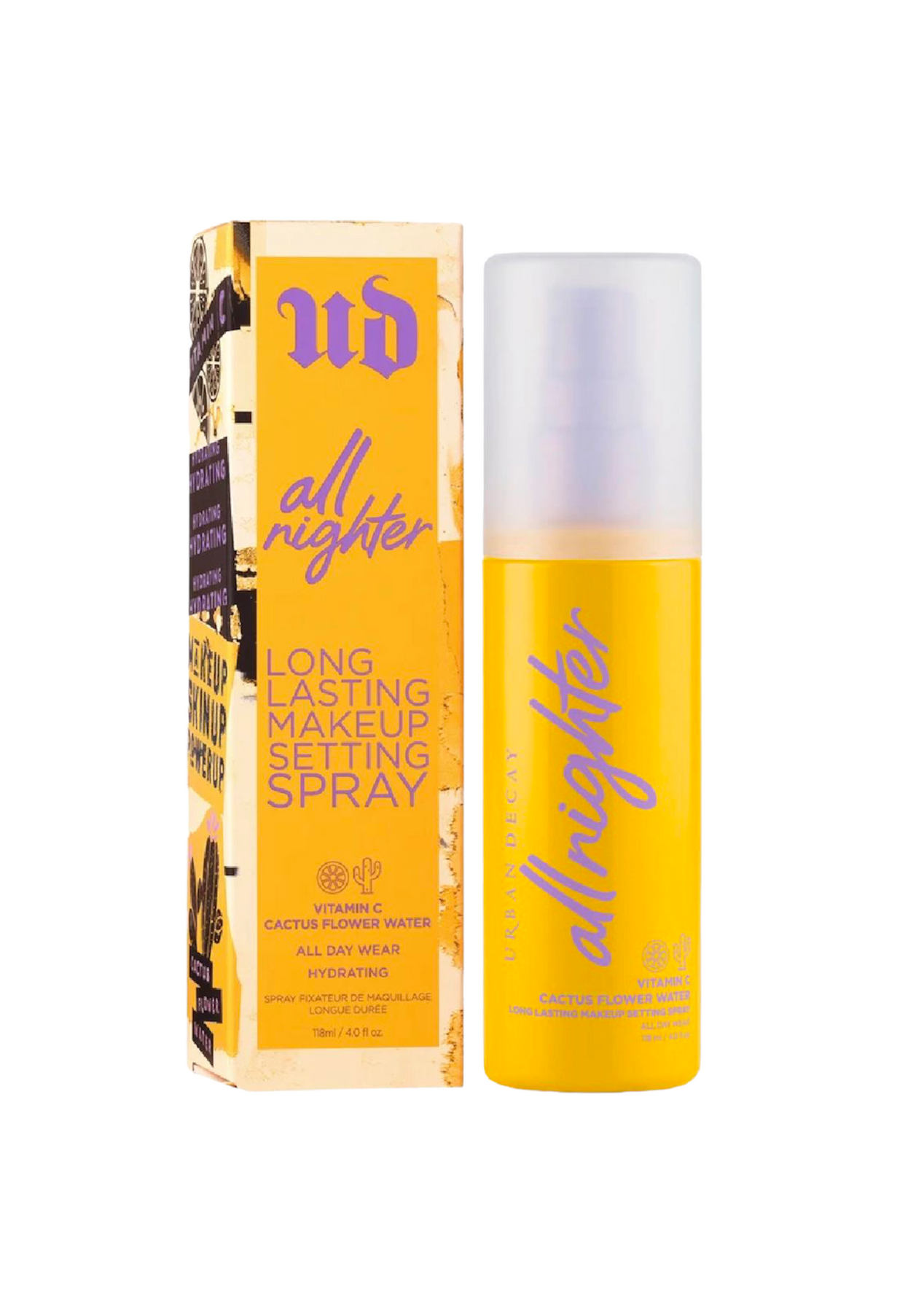 URBAN DECAY All Nighter Vitamin C Setting Spray is designed to help your makeup last for an extended period, powered with Vitamin C it provides a fresh and flawless appearance throughout the day or night. The All Nighter Setting Spray is known for its lightweight and non-sticky citrus scent. It is designed to be sprayed onto the face after applying makeup, creating a fine mist that helps to set and lock the makeup in place. The spray is formulated to provide a long-lasting finish, resisting smudging, fading, and melting, even in challenging conditions such as humidity or heat.