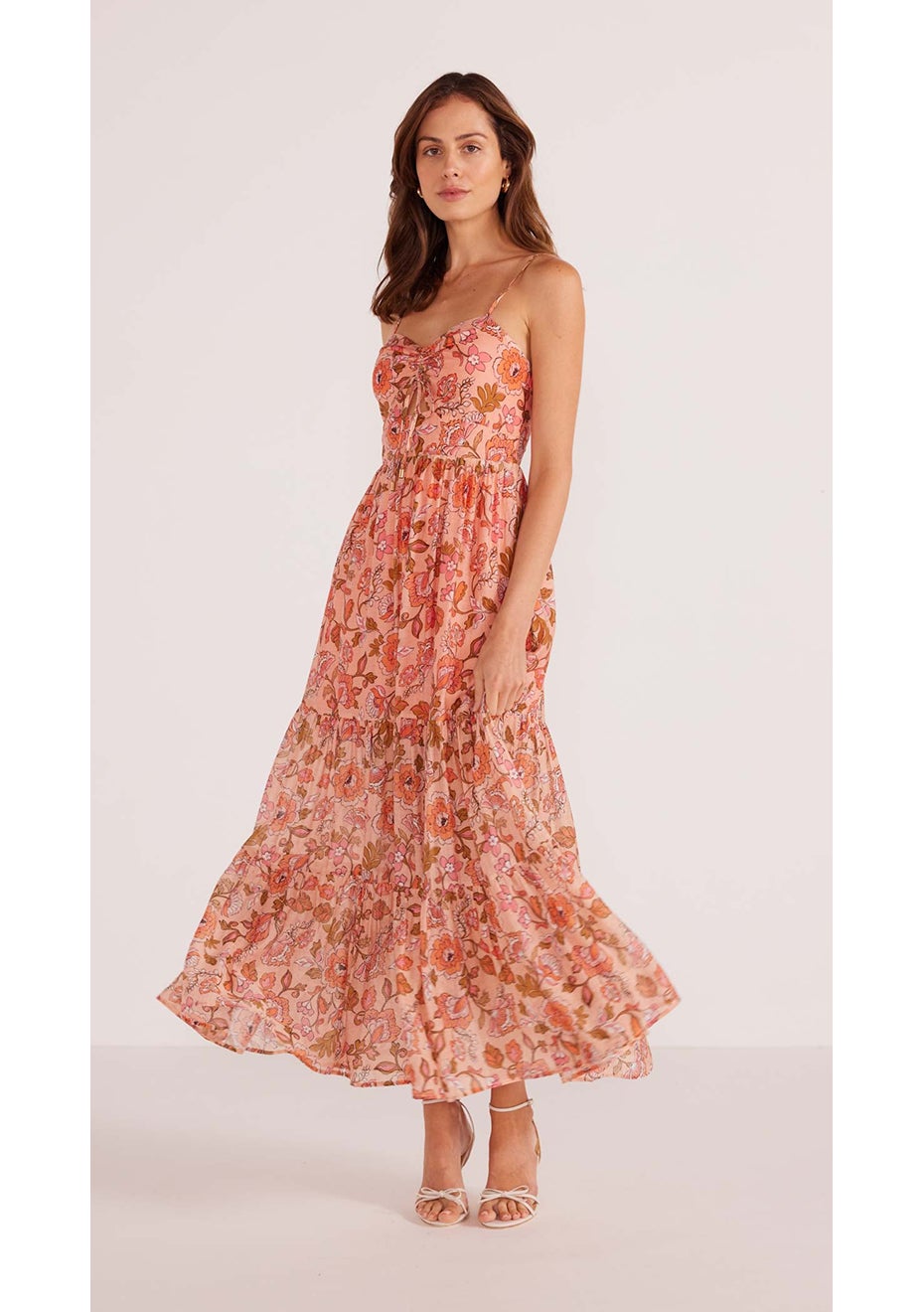 The Amelia Tiered Midi Dress will quickly become a favourite you'll want in every colour and print. Get ready to turn heads at your next event in this exclusive MINKPINK print that will have you receiving compliments all day. Style with sandals for those more casual outings or dress it up with your favourite heels and you're ready to go. - Silky voile - Exclusive MINKPINK print - Lined up to the frilled hem - Shirred back - Midi length - Keyhole cut out at front bust - Drawstring detailing around bust - Adjustable straps - Designed in Sydney, Australia Composition: 80% Viscose 20% Polyamide, Lining: 100% Viscose - Hand wash with mild soap in cold water - Wash separately - Do not bleach/soak/wring or tumble dry - Dry flat in the shade - Cool iron if needed on the reverse side