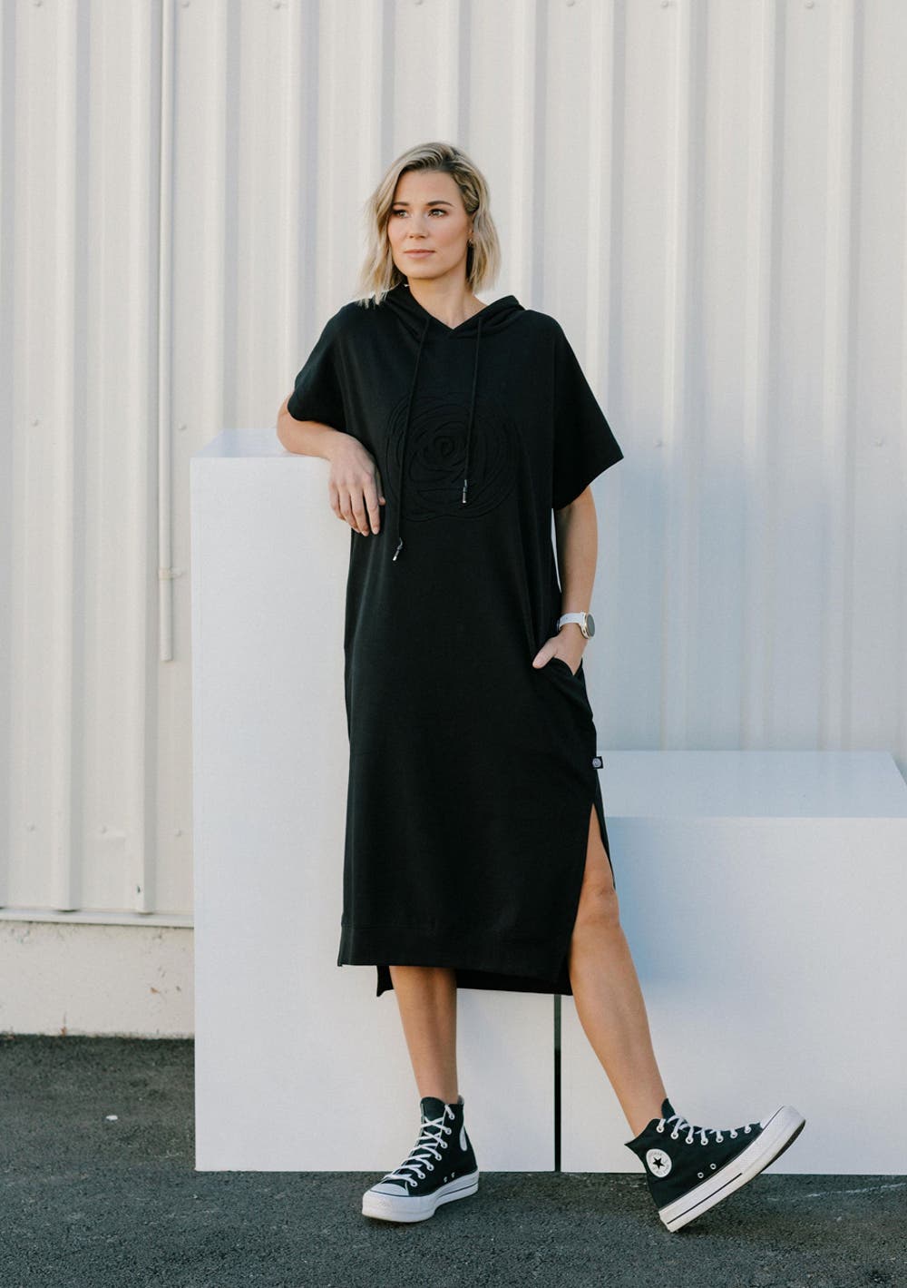 Street fashion meets loungewear with our Cruz Dress. This relaxed style dress is oversized and comfortable. Featuring a drawstring hood, cropped sleeve, in seam pockets, side splits and our signature debossed Rose on the front. Crafted from a luxurious cotton elastane sweat shirting fabric this dress is super comfortable and on trend.