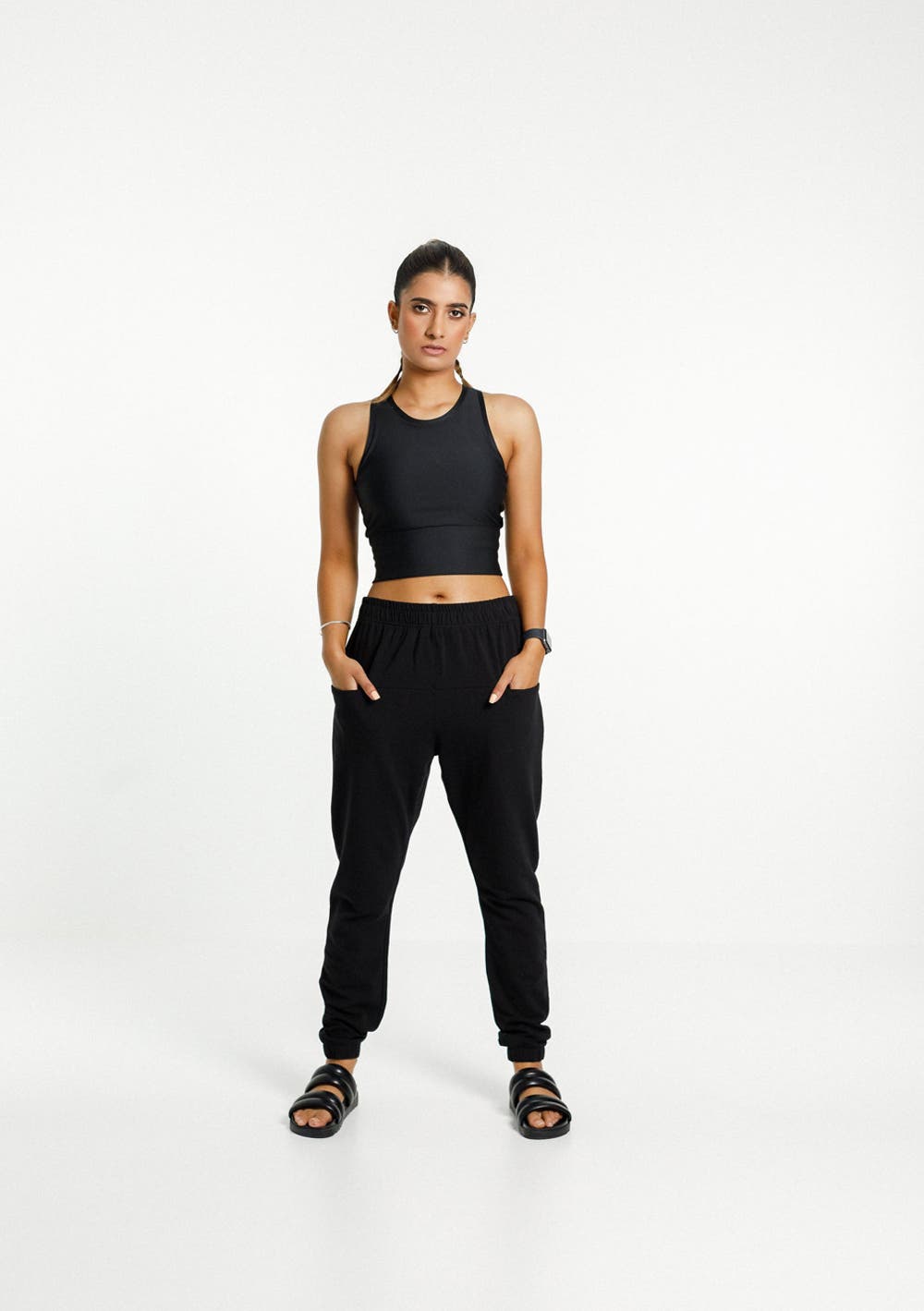 The Stadium pant is a relaxed mid-rise pant with an elasticated waistband and cuff, front pockets and our signature tonal gloss Rose Road Rose on the back pocket.