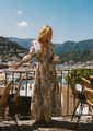 In a bold outsize hibiscus print, this elegant maxi dress features a deep V neckline, blouson sleeves with elastic cuffs, and waist cut-outs finished with a central tie detail. It works beautifully with gold accessories and chunky heels for an elegant day-to-night look.