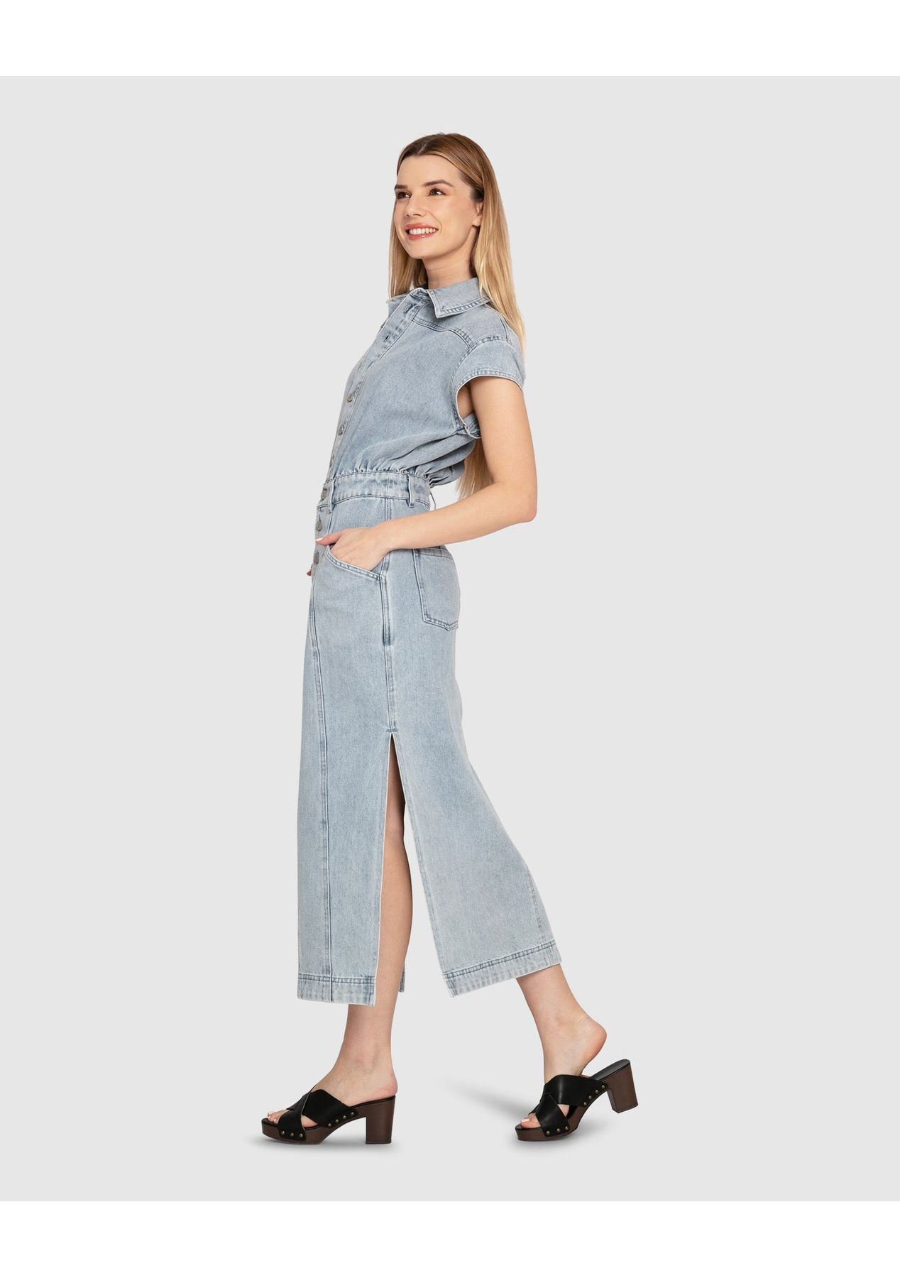 Embrace denim with the Sundown Midi Shirt Dress, featuring short cap sleeves and a side slit perfect for the warmer months plus a button down front and plenty of pocket space to keep with the classic denim features we all love. 100% Cotton Length: 128cm (centre back, size small) Unlined Silver hardware Button down front Side splits (length: 45cm) Cap sleeves