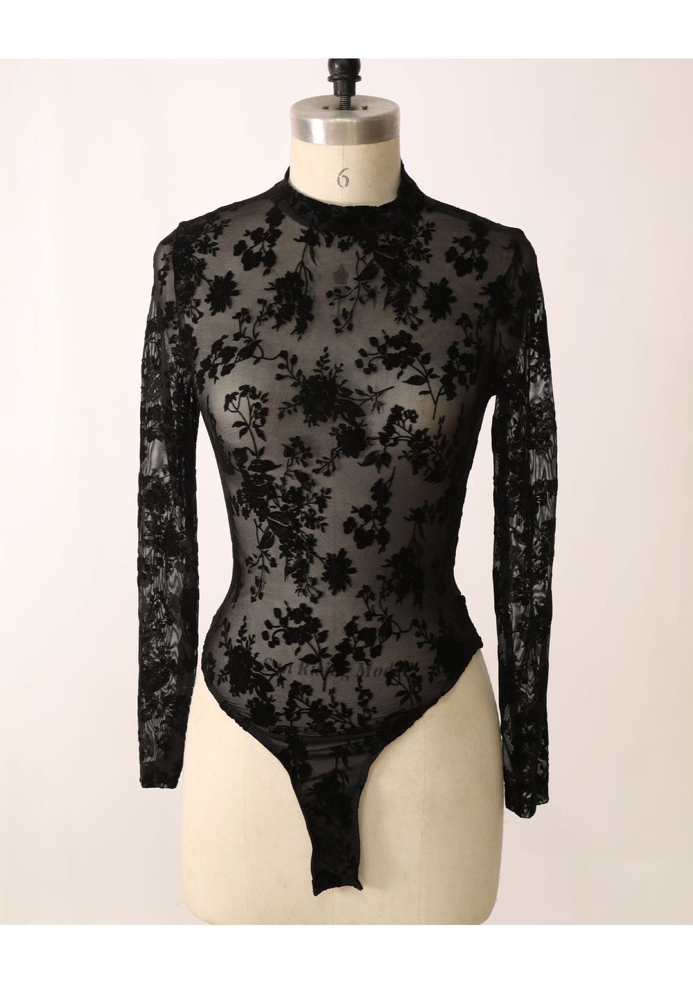Belle & Bloom - Long Sleeve Mesh Lace Bodysuit - Black