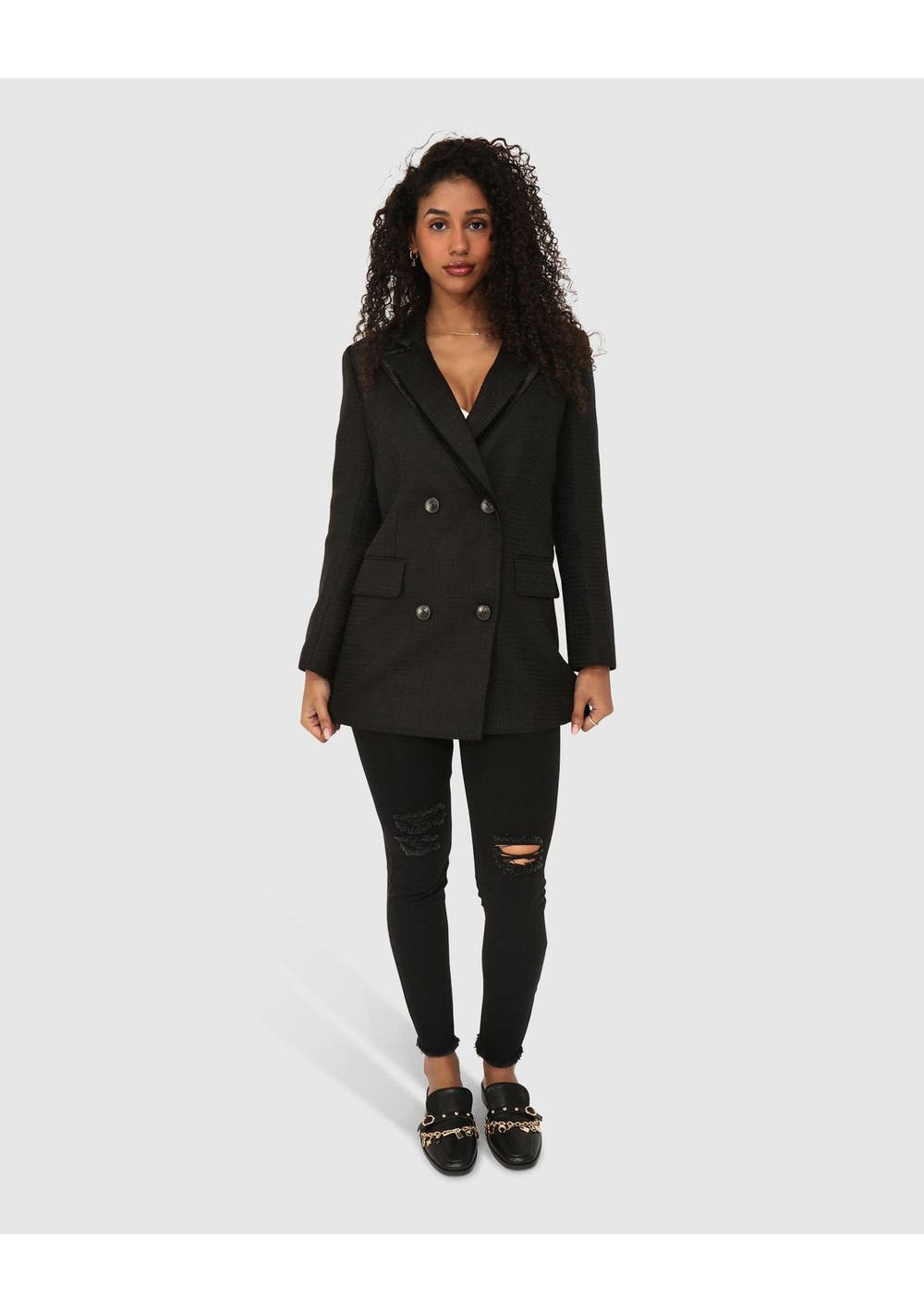 The classic tweed texture of the Because Of You Trimmed Blazer Dress is modernised with a bold contrast bind and buttons. Style closed as a mini dress, or wear as a blazer over your favourite outfit – this jacket offers endless styling options. Composition: 100% Polyester Fully lined Double breasted Contrast grosgrain trim Peak lapel