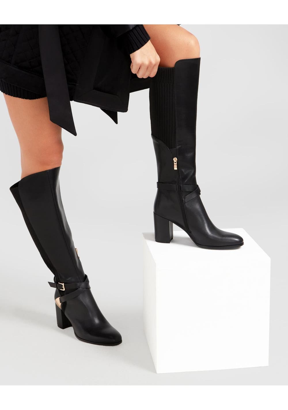 Polished gold hardware, slender leather straps and ribbed panels add an equestrian edge to the Breton Knee-High Boot in smooth leather with the perfect height heel to take you comfortably from day to night. Heel height: 8.4cm Shaft height: 34 cm Genuine Leather Black elastic side gussets Gold hardware Inner side zipper