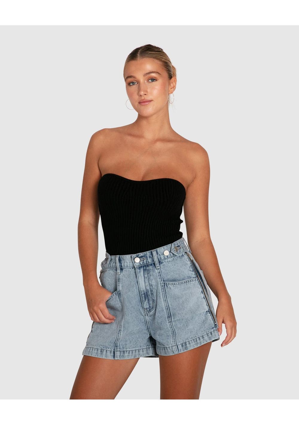 High waisted with an adjustable waistband for the perfect fit, the Bring The Heat Denim Shorts also feature zip-up side vents, so you can say goodbye to denim short fit struggles forever! Composition: 95% Cotton, 5% Other Stonewash finish Silver hardware Adjustable button waist with elastic back Zip-up side vents Front and back pockets