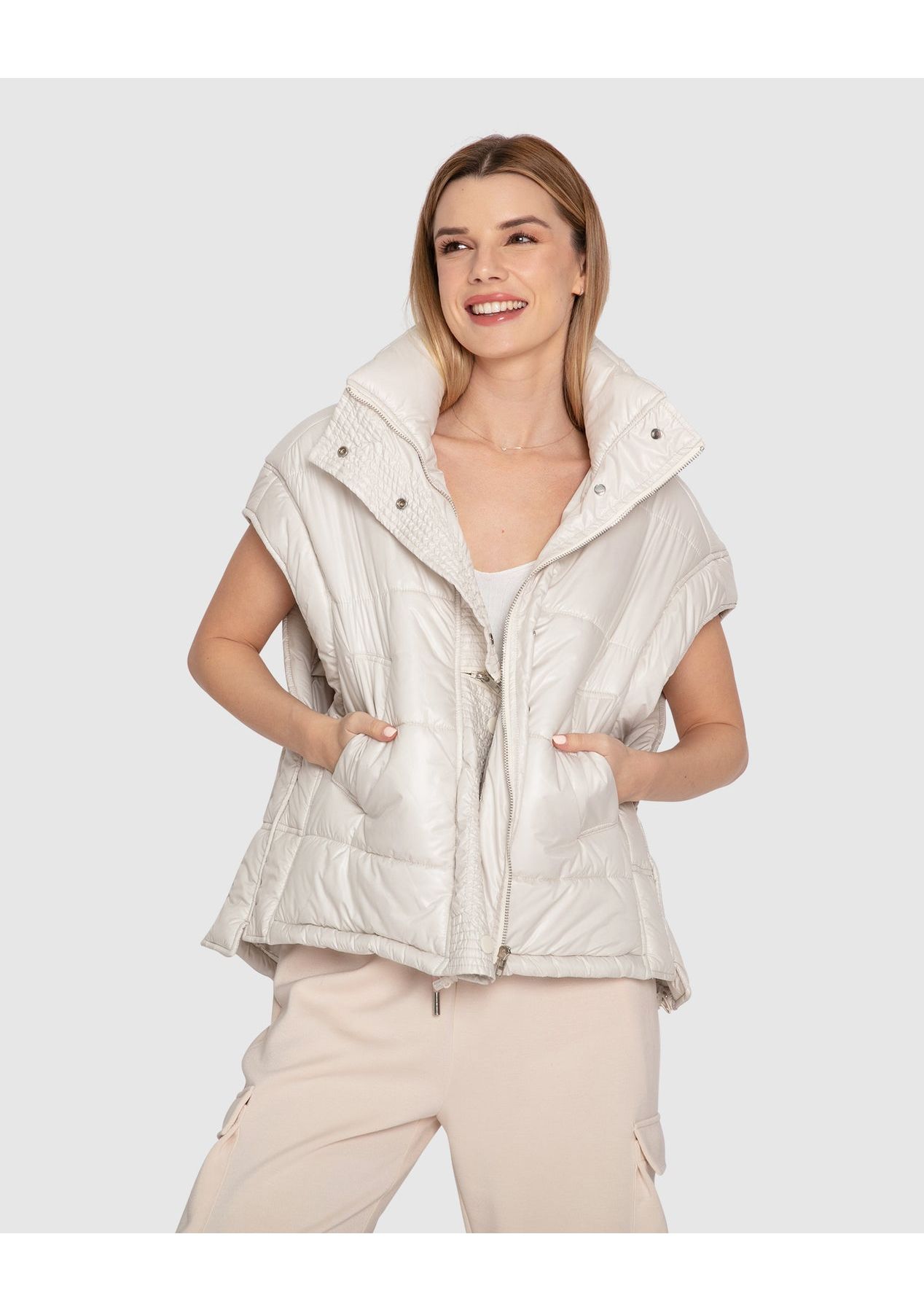 Stay stylish and comfy with the subtly pearlescent Hypnotized Puffer Vest, featuring a zipper fastening hidden by a stud placket to keep you extra cozy. The adjustable drawstring hem and pockets are perfect for any adventure! Main: 100% Polyester Fill: 100% Polyester Length: 57cm (front, size small) Front zipper closure Drawstring hem Pockets
