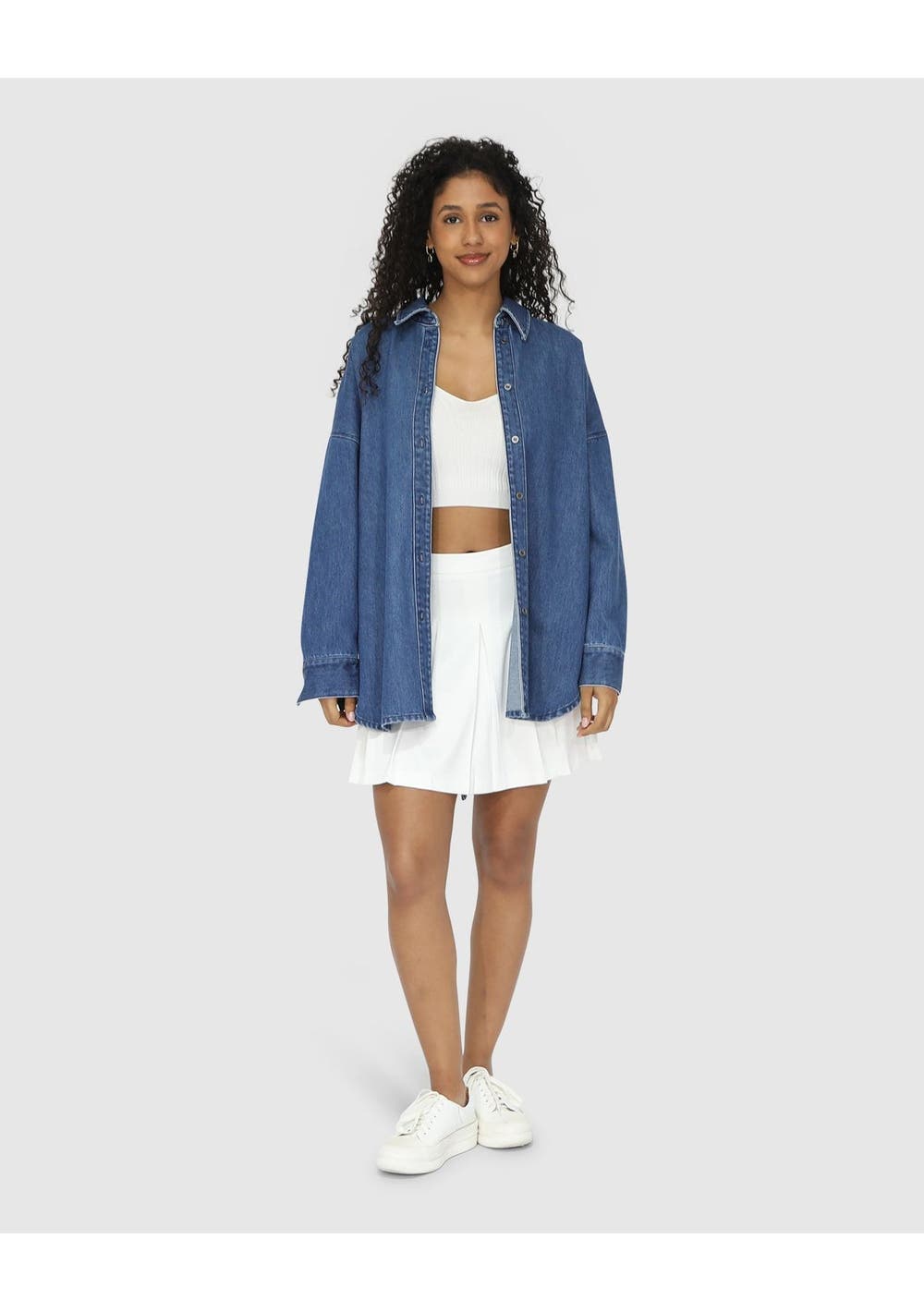 Ideal for easy layering, the Into Him Oversized Denim Shirt features a rounded hem and unique eyelet and tie detail on the back vent. Composition: 100% Cotton Oversized fit Rounded hem Gold hardware Eyelet & tie detail on back vent