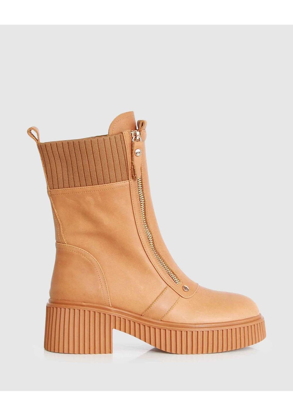 Ribbed panels and a unique chunky lug sole add a contemporary edge to this zip up- moto boot. Featuring a rounded toe and gleaming gold hardware the More To Come Ankle Boot is sure to become your everyday go-to wardrobe staple. Heel height: 5.5cm Shaft height 18cm Bonded leather Gold hardware Chunky lug sole Zipper front Round toe