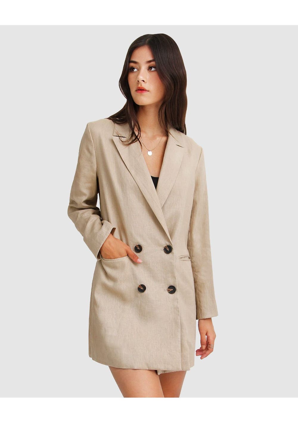 Elevate your smart-casual looks for summer with the Princess Anna Blazer Dress. Relaxed, yet chic, the oversized fit blazer dress in linen can be worn on its own over a mini slip dress or as a jacket with jeans and a crop top. Length: 82cm (size small) Fabric: 100% Linen Lining: 100% Polyester Double breasted Long sleeves Notched collar Double welt pockets Oversized fit