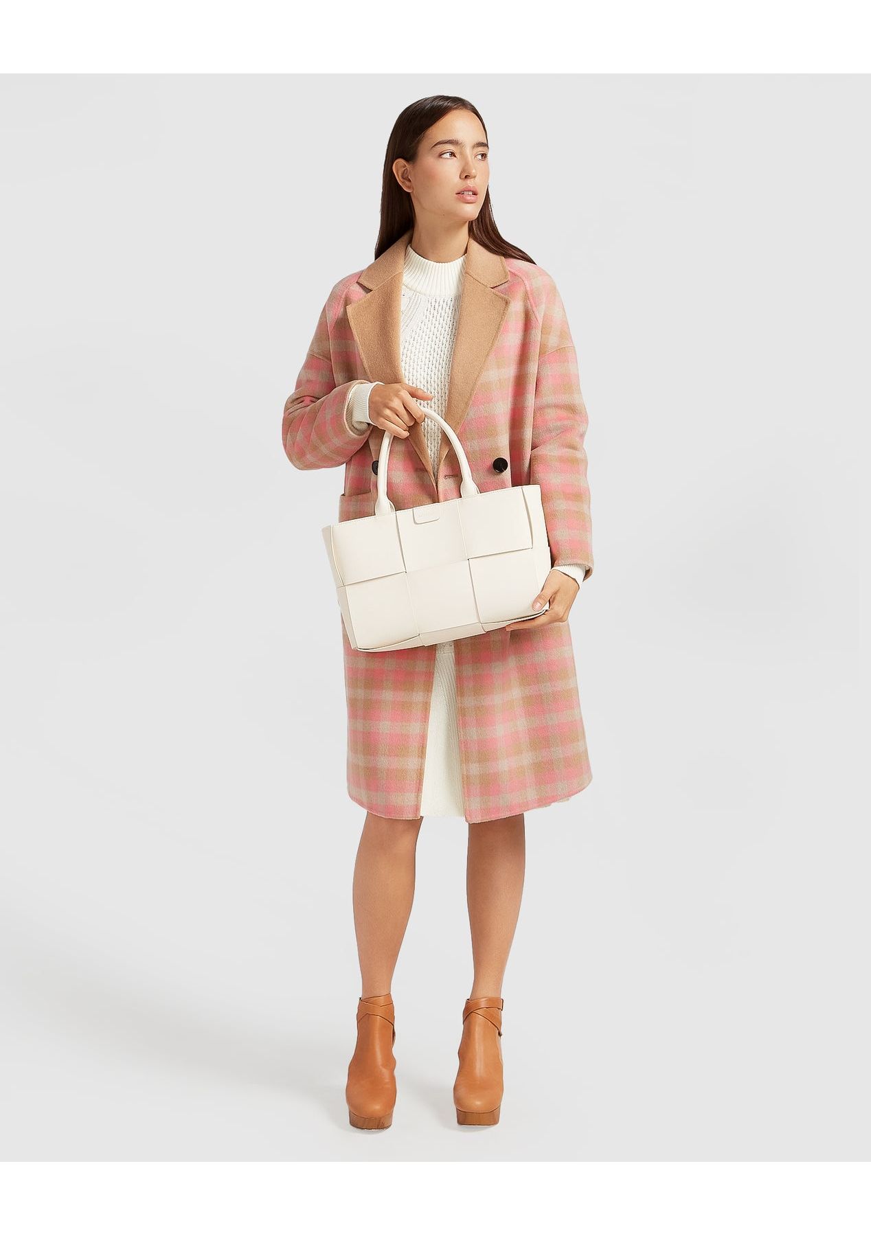 Inspired by global fashion editors, the Publisher Double-Breasted Wool Blend Coat in an oversized fit is the modern take on the tailored notched collar coat. This smart casual piece coat emits boss girl vibes for your winter workwear style, with the added fun of our almost neon pink check reminiscent of Iced Vovo biscuits. Designed for an oversized fit. Take your usual size for the intended look or size down for a neater look. Length: 102cm (size small) Composition: 50% Wool, 50% Polyester Notched collar Patch pockets Double-breasted button closure Double brushed wool, no lining