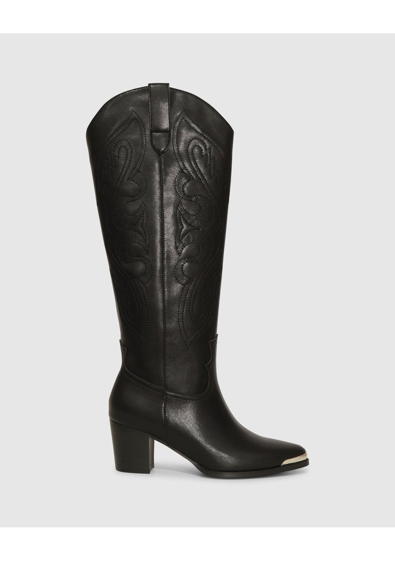 Strut into winter in the Rebelle Knee High Western Boots. Featuring a silver capped toe with embossed detailing and a custom designed stitching pattern up the shaft, you will want to keep them on from day to night all year round. Coated Leather Heel height: 7cm Shaft height: 38cm Rounded point toe Silver metal etched toe cap Faux stacked heel