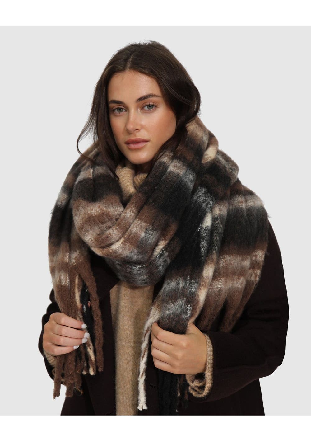 A sophisticated and versatile accessory that exudes elegance. Featuring a classic check pattern in rich chocolate browns and deep darker tones, this scarf offers a luxurious take on neutral shades. Perfect for layering, it adds warmth and depth to any outfit while keeping your look effortlessly stylish.