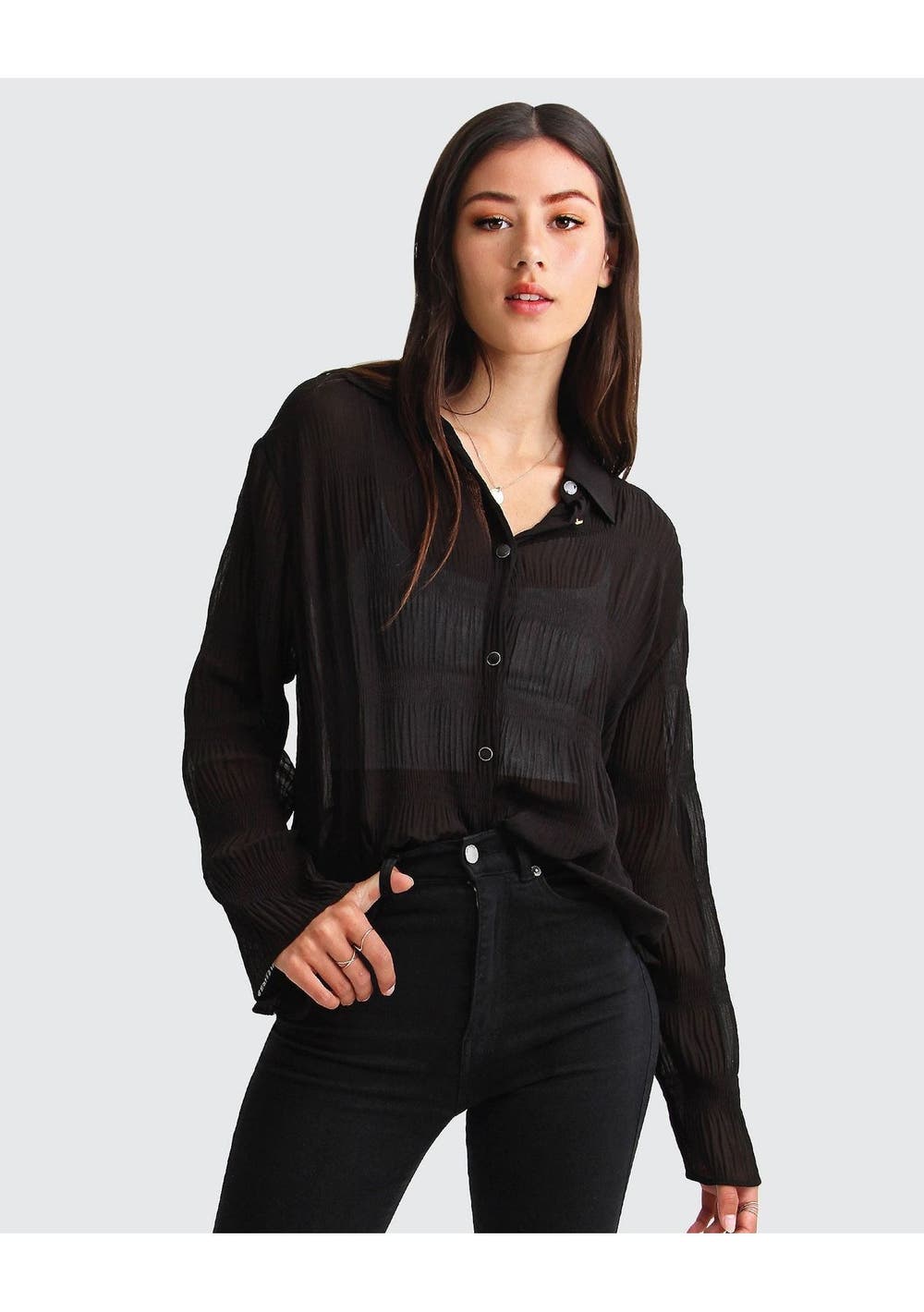 Bring some texture to your workwear with the Yoko Shirred Chiffon Blouse with its broomstick pleated chiffon fabric, perfectly accentuated with bell sleeves. Extra details such as gold rim enamel buttons and a loose fit make this a great addition to your basics. Length: 70cm (size small) Composition: 100% Polyester Long sleeve Decorative buttons Loose fit