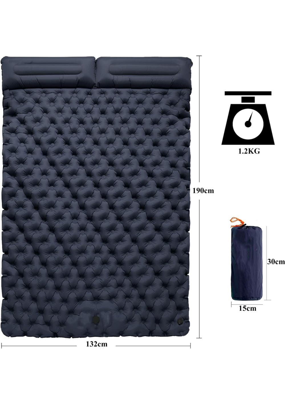 Inflatable Sleeping Mat with Built-In Pillow and Pump – Navy Material: 40D Nylon Fabric + TPU Coating Product Dimensions (LWH): When inflated 190×132×5cm Package Dimensions (LWH): 30 x 15 x 15 cm Weight: 1.2 kg Enhance your outdoor adventures with this durable, lightweight, and comfortable sleeping mat. Whether you're exploring new trails or enjoying a festival, this mat promises ease of use and a peaceful night's sleep, no matter where you find yourself. Ultra-Lightweight Design: Weighing only 1.2 kg, this inflatable sleeping mat is as light as two water bottles, making it ideal for backpackers and travelers seeking lightweight comfort. Enhanced Comfort & Support: Boasts a 6CM thick mattress with innovative sealing technology that minimizes air leaks and a built-in 14CM pillow for superior head support. Durable & Waterproof: Crafted from rugged 40D nylon with a TPU coating, this mat resists water and wear, ensuring durability and dry comfort in any outdoor setting. Versatile and Supportive: Suitable for individuals weighing up to 150KG, providing consistent, robust support for a restful sleep under the stars. Package Includes: 1x Sleeping Mat 1x Carry Bag