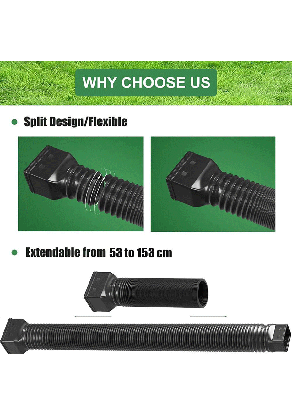 【SPLIT DESIGN】: downspout extender uses a split design, the interface is made of abs injection molding, will not tear off and crack, the hose uses high-quality pe material hose, no crease, no hole, will not crack, durable.