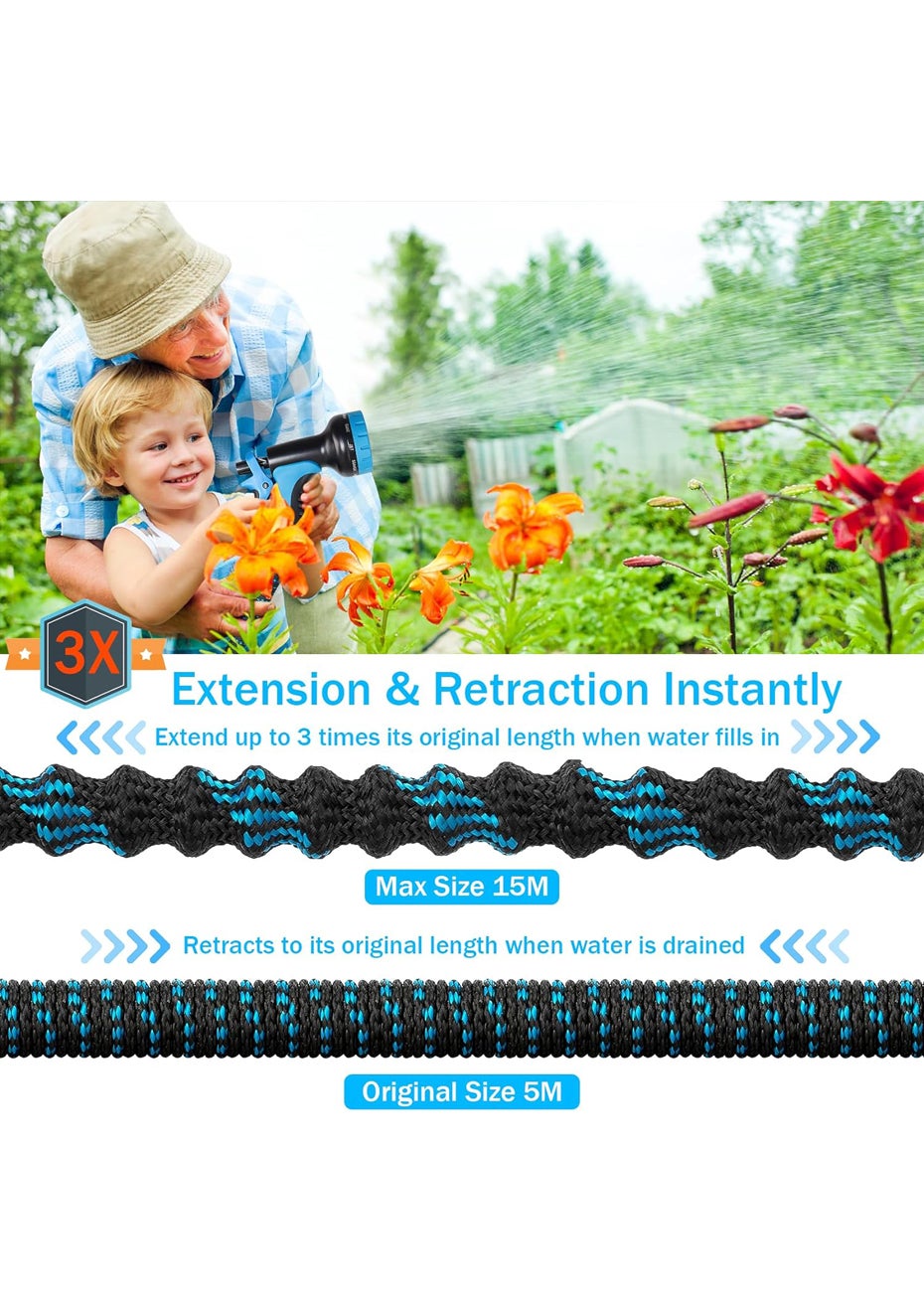 Expandable Garden Hose Pipe - 15M Material: Polyester, Plastic, Rubber Product Dimensions (Unexpanded): 5M Product Dimensions (Expanded): 15M Package Dimensions: 26 x 17 x 12 cm Weight: 1.36 kg Elevate your gardening and outdoor cleaning with our versatile Expandable Garden Hose Pipe. Experience a hassle-free operation as it triples in length to 15M with water fill and retracts with ease. Tailor your watering with a 10-function spray gun that provides everything from a gentle shower to a powerful jet. Constructed with high-quality materials, including a triple latex core and tough 3750D fabric, it's designed to last through every season. The comprehensive fitting kit with alloy adapters ensures a perfect fit for most taps, offering a leak-free experience. This hose is not just for gardening; it's a multipurpose tool for all your cleaning tasks and outdoor fun. Say goodbye to tangles, kinks, and wrestling with heavy hoses - our lightweight, retractable design promises simplicity and joy in your daily chores. Main Features: Triple-Stage Expansion: Automatically expands up to 3 times in length (5M to 15M) when water pressure is applied and retracts after use for easy storage. Multi-Function Spray Gun: Features 10 unique watering patterns to cater to various gardening and cleaning needs. Durable Material Construction: Crafted with a triple-layered latex core and protected by a strong 3750D polyester fabric to withstand high water pressures and prevent wear. Superior Hose Fittings: Includes corrosion-resistant alloy adapters (3/4" & 1/2") with a rubber gasket to ensure a secure and leak-proof connection. Versatile Use: Perfect for a multitude of tasks including watering plants, cleaning exteriors, washing vehicles, and even fun water activities with family. Product Specifications: Package Contents: 1x Expandable Garden Hose Pipe 1x 10-Function Spray Gun 1x Alloy Adapters Set 1x Rubber Gasket