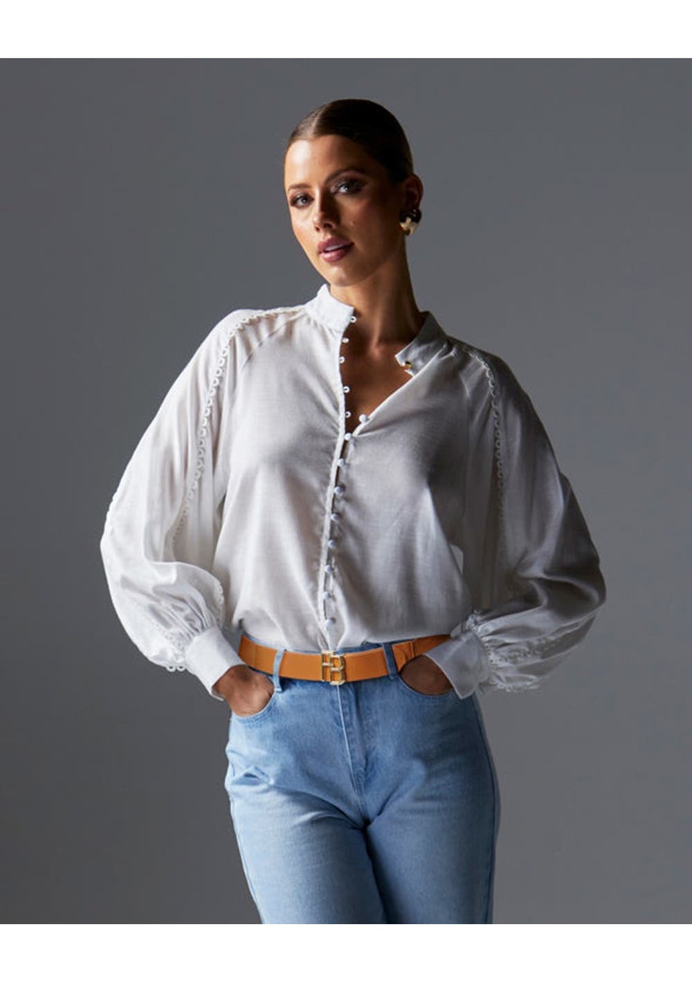 Elevate your wardrobe with the Berry Kiss Blouse from Fate+Becker. Designed in a flattering regular fit, this blouse features long blouson sleeves adorned with trim detail for a touch of elegance. The button-through front and wide cuffs add sophistication, making it a versatile piece for both casual and dressy occasions. -Regular Fit -Long Blouson Sleeves with Trim Detail -Button Through Front -Wide Cuffs Fabric and Care 95% Viscose 5% Linen Warm gentle machine wash and warm iron