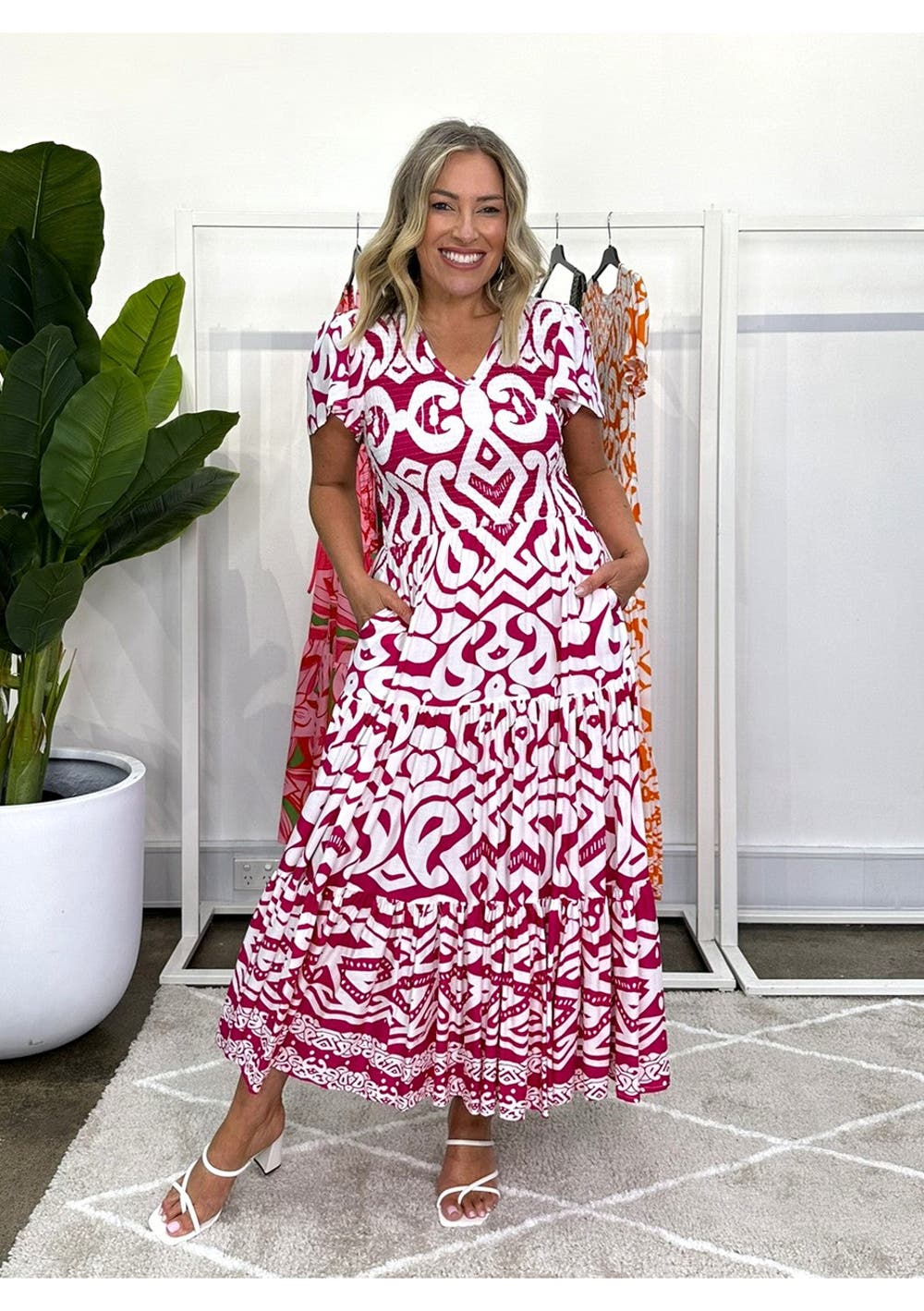 This beautiful poplin maxi Ira Dress designed by Leoni is a must for the summer months and coming holidays, with short frill sleeves and a defined waist details to elevate the look. A ruffled hem adds a finishing touch for elegance and femininity. Elevate your style with this timeless and sophisticated Ira Dress! V neck detail Short frill sleeves Defined shirred upper body Maxi length Poplin 100% viscose Hand wash cold, hang dry