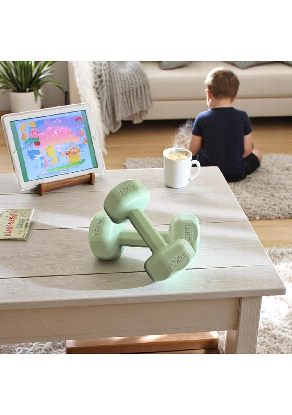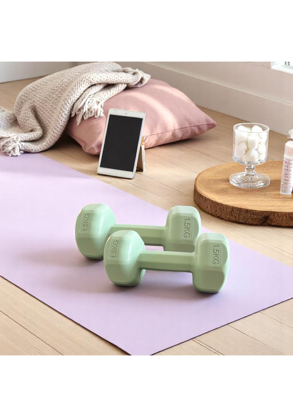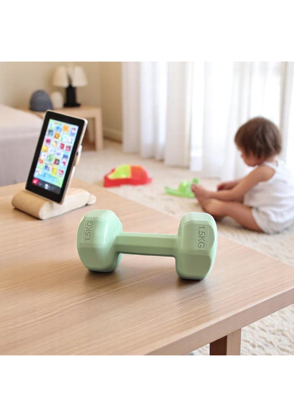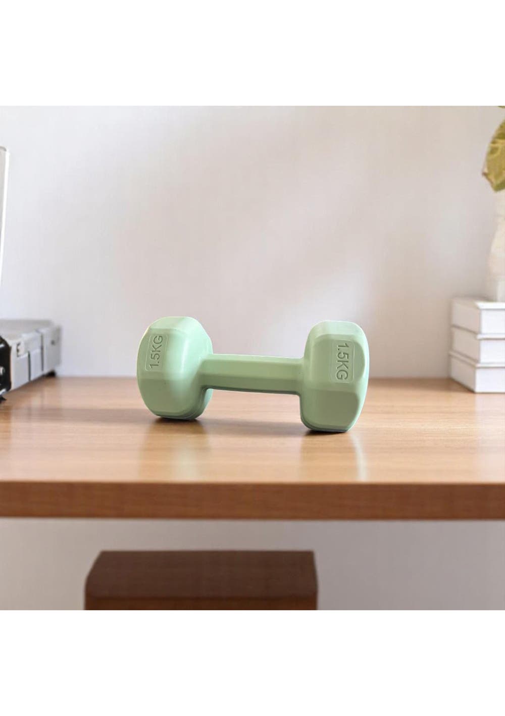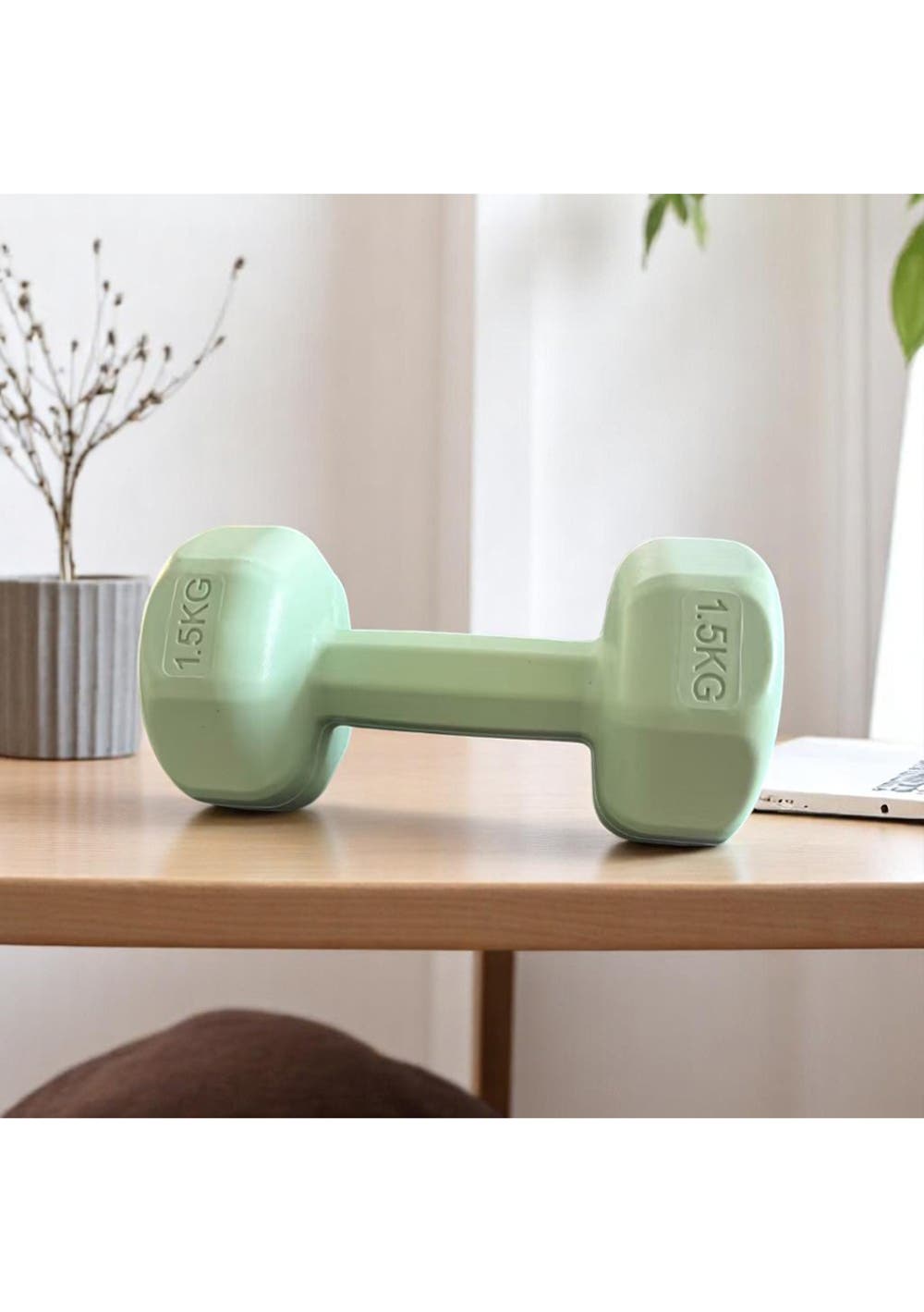 2 Pack Dumbbells Set 1.5KG Each PVC Coated Hand Weights for Women Home Fitness Strength Training Green Material PVC shell Cement core Product Dimensions 9.82×19.5cm each Package Dimensions 18.5×9.5×18.5cm Weight 3kg total 1.5kg per dumbbell Key Features Compact and Durable Design Each dumbbell features a one-piece solid cement core for durability and stability during workouts Comfort Grip Handle Textured PVC coating ensures a secure and comfortable grip without slipping or irritation Floor Safe Coating Soft plastic outer layer protects floors from damage and reduces noise when dropped Ideal for Home Workouts Small and space-saving design makes it perfect for yoga Pilates aerobic and strength training at home Beginner Friendly Weight 1.5kg per piece is ideal for women teens or beginners starting resistance training Product Description This 2-pack of 1.5kg dumbbells offers a comfortable and stylish way to add resistance to your daily workout. Compact design and soft coating make them perfect for home fitness without damaging your floors Package Includes 2 x Dumbbells 1.5kg each Green
