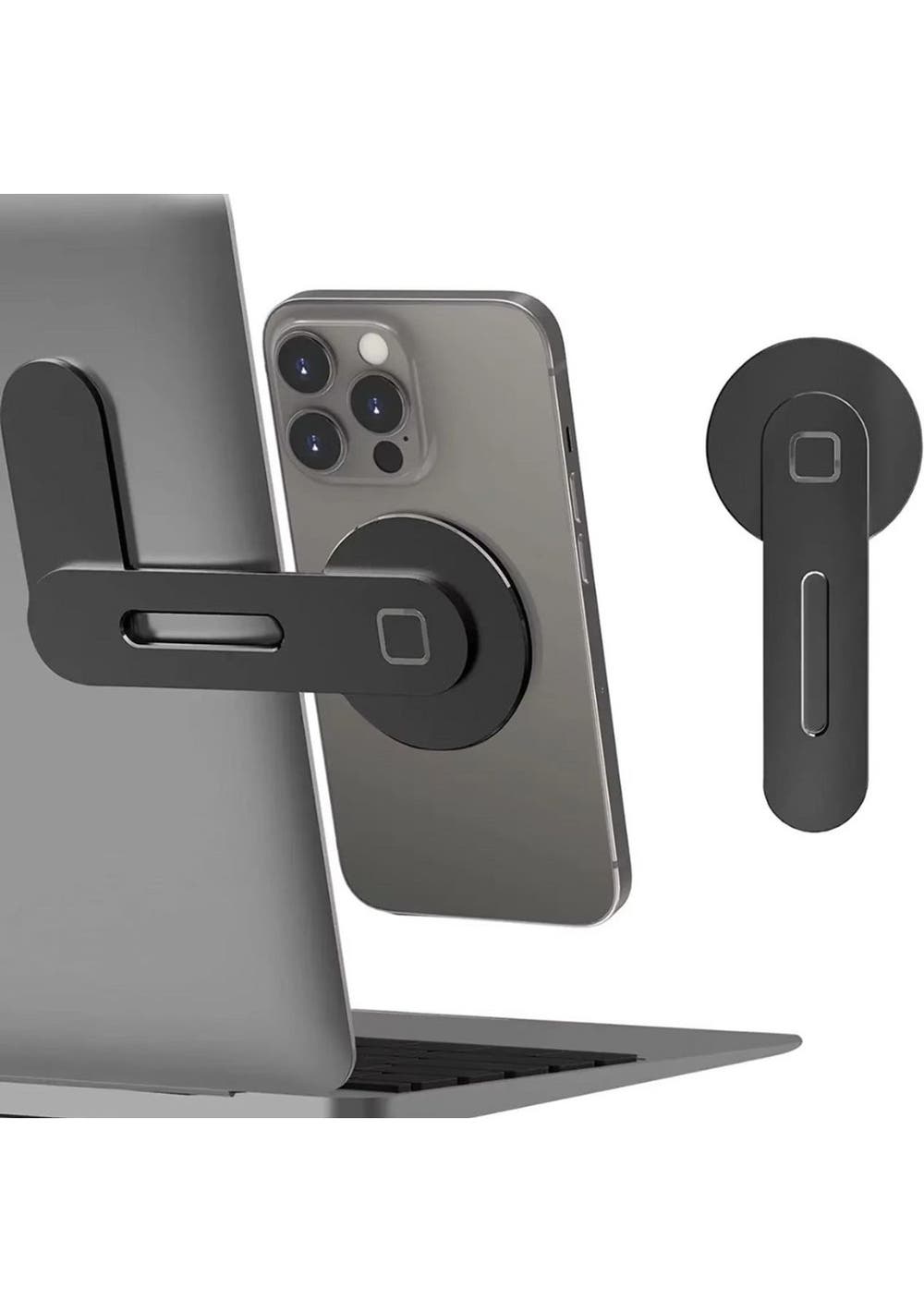 Product Description:This versatile and innovative magnetic smartphone stand is compatible with the latest iPhone 13 and 12 series, including MS cases. For non-magnetic phone cases, a magnetic ring is included for easy attachment, ensuring wide compatibility.Designed for dual-screen convenience, this cellphone holder is ideal for use on all flat screen computer monitors. It allows easy phone access during work without interrupting workflow, enhancing productivity and multitasking efficiency.With a magnetic attachment and 180° adjustable design, the stand securely mounts your phone next to a laptop or monitor, providing a comfortable viewing angle for video calls, messages, or multitasking needs.Crafted from ultra-thin aluminum alloy and equipped with strong 3M adhesive, the stand offers durability and stability. When not in use, it folds flat and stays hidden behind the laptop, making it perfect for portable, clutter-free workspaces. Product Specification:Material: Aluminum AlloyColor: Black, SilverSize: 0.7 x 5.6 x 13cmWeight: 79gFunction: Phone HolderPackage Inclusion:1 x Magnetic Laptop Phone Holder