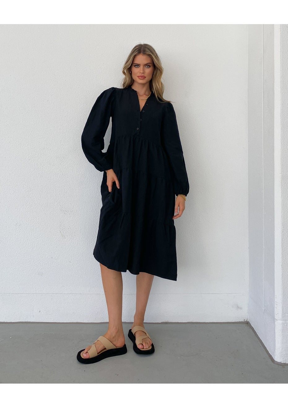 Collared shirt dress. - Long, balloon sleeves. - Centre front button closure. - Gathered tiers throughout. - Maxi length. - Relaxed fit