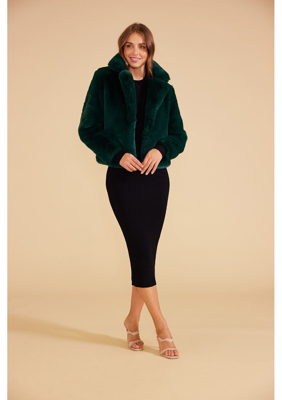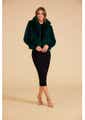 Dark green faux fur jacket - Over-sized lapels - Full length sleeves - Slightly cropped bodice - Hook & eye closure
