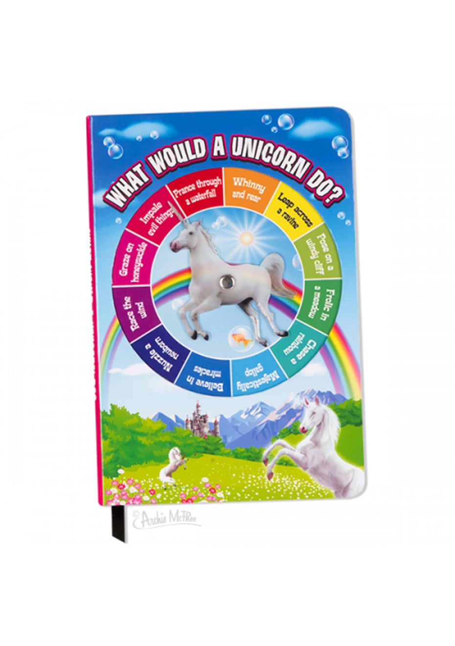 IT'S LIKE DEAR ABBY, BUT WITH A HORN ON HER FOREHEAD What would a unicorn do? This unicorn-centric writing supply has a spinner on the front to help you decide what to do in ethically challenging situations. Twirl it and get answers like "majestically gallop" or "race the wind." Each notebook has 56 pages of 7½†x 5¼†(19.1 cm x 13.3 cm) ruled paper where you can ponder the mysteries of life or plot out your next fantasy novel. Bookmark ribbon. Bagged. ISBN.