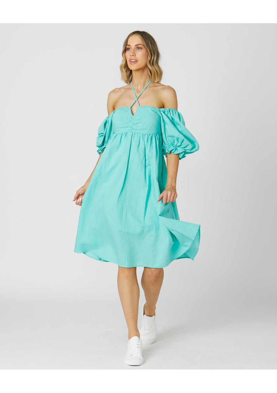 The Mila midi dress can be worn off the shoulder or as a set in, making it flexible for any mood. Shirred Back Bodice Balloon sleeve detail Tie front neck Babydoll silhouette Midi length 100% Linen