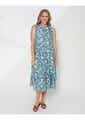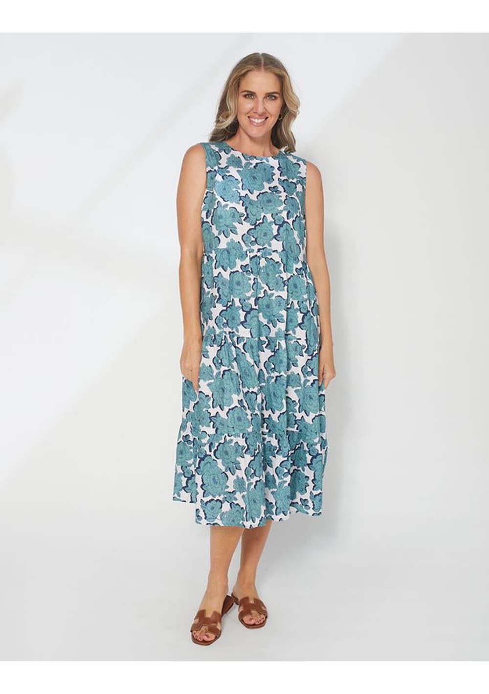 Tiered A line sleeveless midi dress with crew neckline.