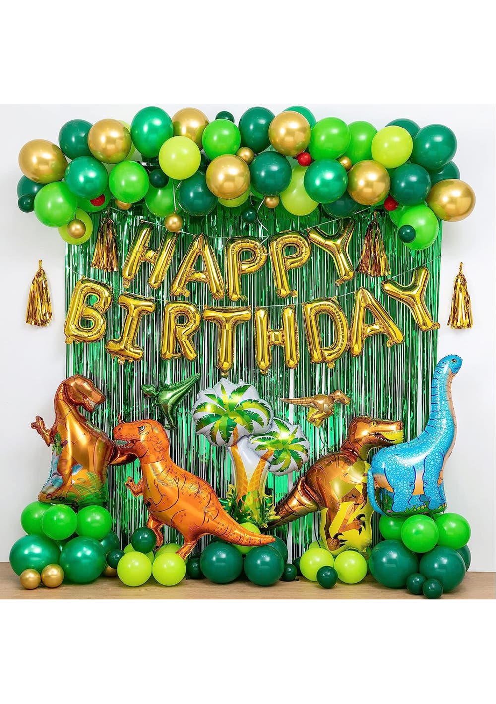 Dinosaur Birthday Party Decorations Balloons Kit<br><br>Material: Paper, Aluminum Foil, Latex<br>Package dimensions (LWH): 30 x 18 x 8 cm<br>Weight: 520g<br>Celebrate the perfect Dinosaur Birthday Party! This comprehensive kit offers everything you need to immerse your guests in a prehistoric world of fun and adventure. Ideal for kids and adults alike who have a fascination with the mighty creatures of the past.<br><br><br><br>Features:<br>• Comprehensive Dino Party Set: This all-in-one kit has everything you need to throw the perfect dinosaur-themed party! With a variety of balloons in rich colors, unique dinosaur-shaped balloons, birthday banners, tassels, and more, it ensures your party is vibrant and memorable.<br>• Simple Assembly: No need for prior decoration experience! With the balloon decorating strip, you can effortlessly craft balloon arches and garlands. Moreover, the included glue points, ribbons, and instruction paper guide you through every step, making setup a breeze.<br>• Superior Quality: Each balloon is made from durable materials – either sturdy latex or aluminum foil – and is rigorously tested to ensure they’re non-toxic, thick, and won't easily burst.<br>• A Prehistoric Celebration: Transport your guests back to the age of dinosaurs! This kit's Jurassic theme, featuring different types of dinosaurs and jungle accessories, promises a fun and lively backdrop for your festivities.<br><br>Package Includes:<br>• 65pcs 10’’ Balloons<br>• 15pcs 5’’ Balloons<br>• 4 Large Dinosaur Balloons: ( Tyrannosaurus Rex, Velociraptor, and Tanystropheus).<br>• 2 Small Dinosaur Balloons<br>• 1 Large Coconut Tree Balloon<br>• 16 Inch Birthday Banner<br>• 2 Green Party Rain Curtains<br>• 5 Gold Paper Tassels<br>• Balloon Decorating Strip & Accessories: Comes with a pack of glue points (100 dots) and 3 balloon flower clips