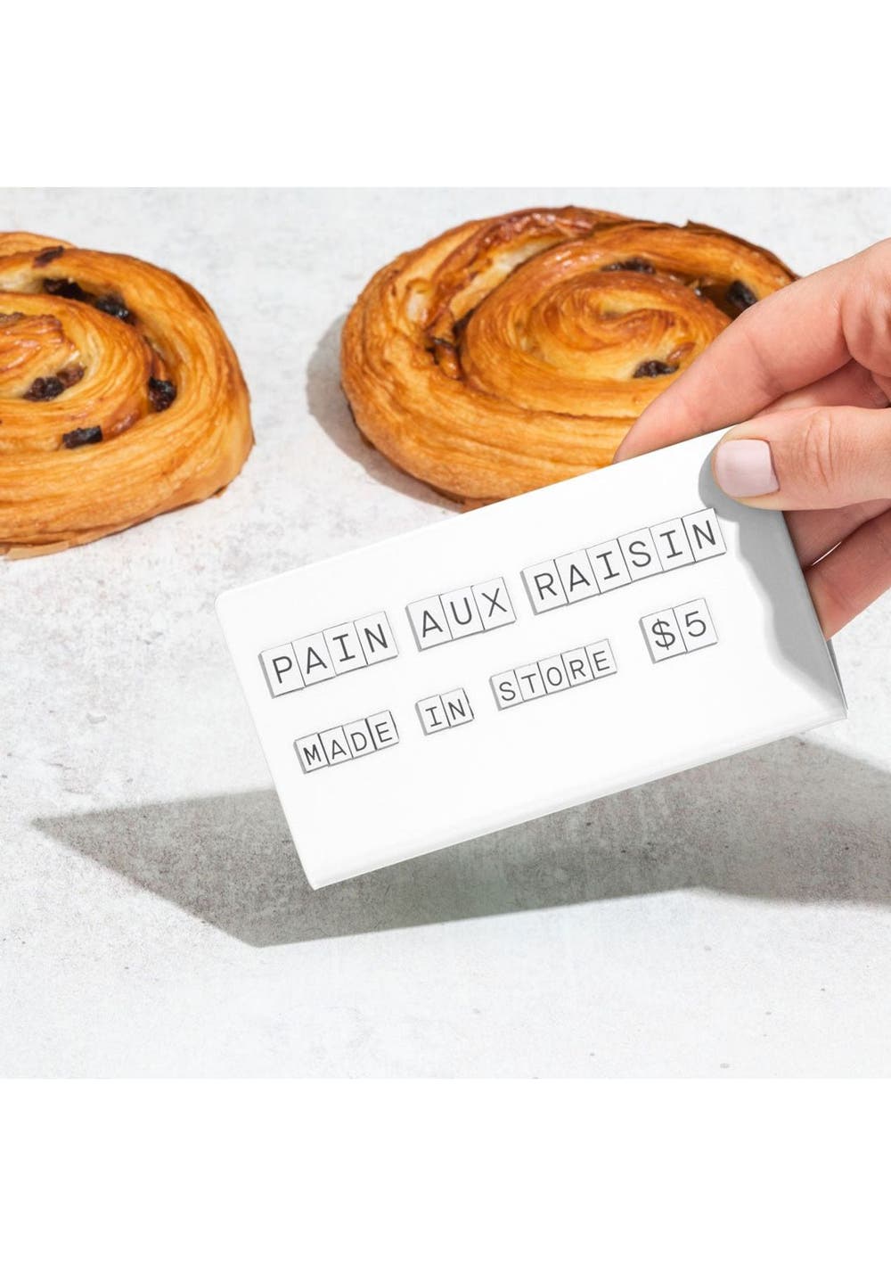 Medium Counter Sign Black A better way to label the little things. Custom counter display signs for pastries, ceramics, and everything in between. Magnet letters make it easy to change what’s on offer. Available in a range of colours, there’s a Counter Sign to display to suit your space. Specifications Sign Face: 11.6cm (L) x 6cm (W) Small Magnet Letters: 0.7cm (L) x 0.5m (W) Large Magnet Letters: 0.9cm (L) x 0.7cm (W) Material: Steel, Magnet Weight: 3.1kgs *Includes 12x individual signs & 2,400+ magnet letters, numbers, and symbols. Suitable for indoor use only.