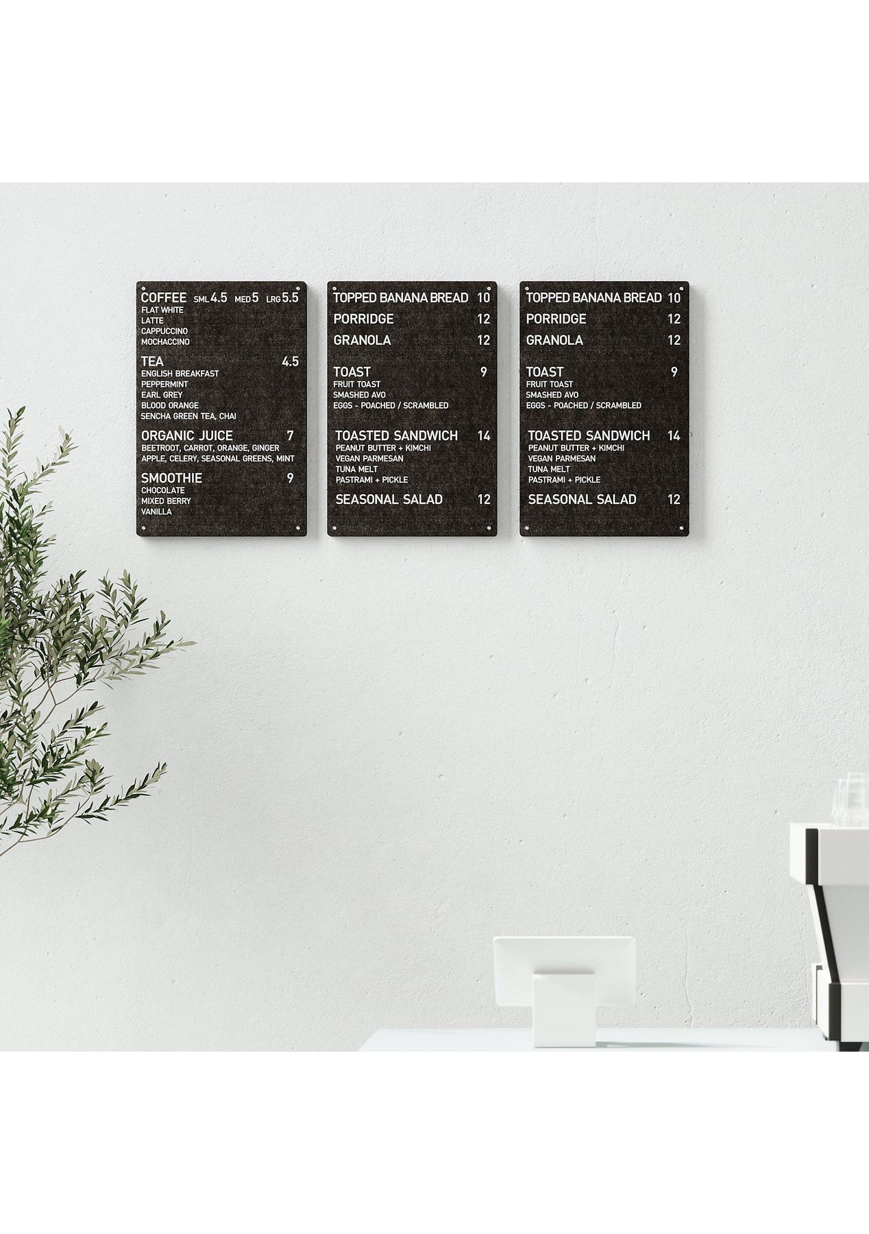 Small Felt Board Light Grey The novelty of felt meets functionality with the Felt Letter Board Menu. Individual peg letters make it easy to update this letterboard sign when your offer changes. Available in two sizes and colours, there’s a felt letter board to suit your space. *NOTE: One quantity is equal to one board, photos showing three boards contain three units. Specifications Small Felt Board: 60cm (L) x 40cm (W) x 2.3cm (D) Regular Letter Height: 1.5cm Large Letter Height: 2.2cm Material: Polyester Weight: 3.92kgs Large Felt Board: 80cm (L) x 60cm (W) x 2.3cm (D) Regular Letter Height: 1.5cm Large Letter Height: 2.2cm Material: Polyester Weight: 5.2kgs *Includes 1,120 letters, numbers & symbols. Suitable for indoor use only.