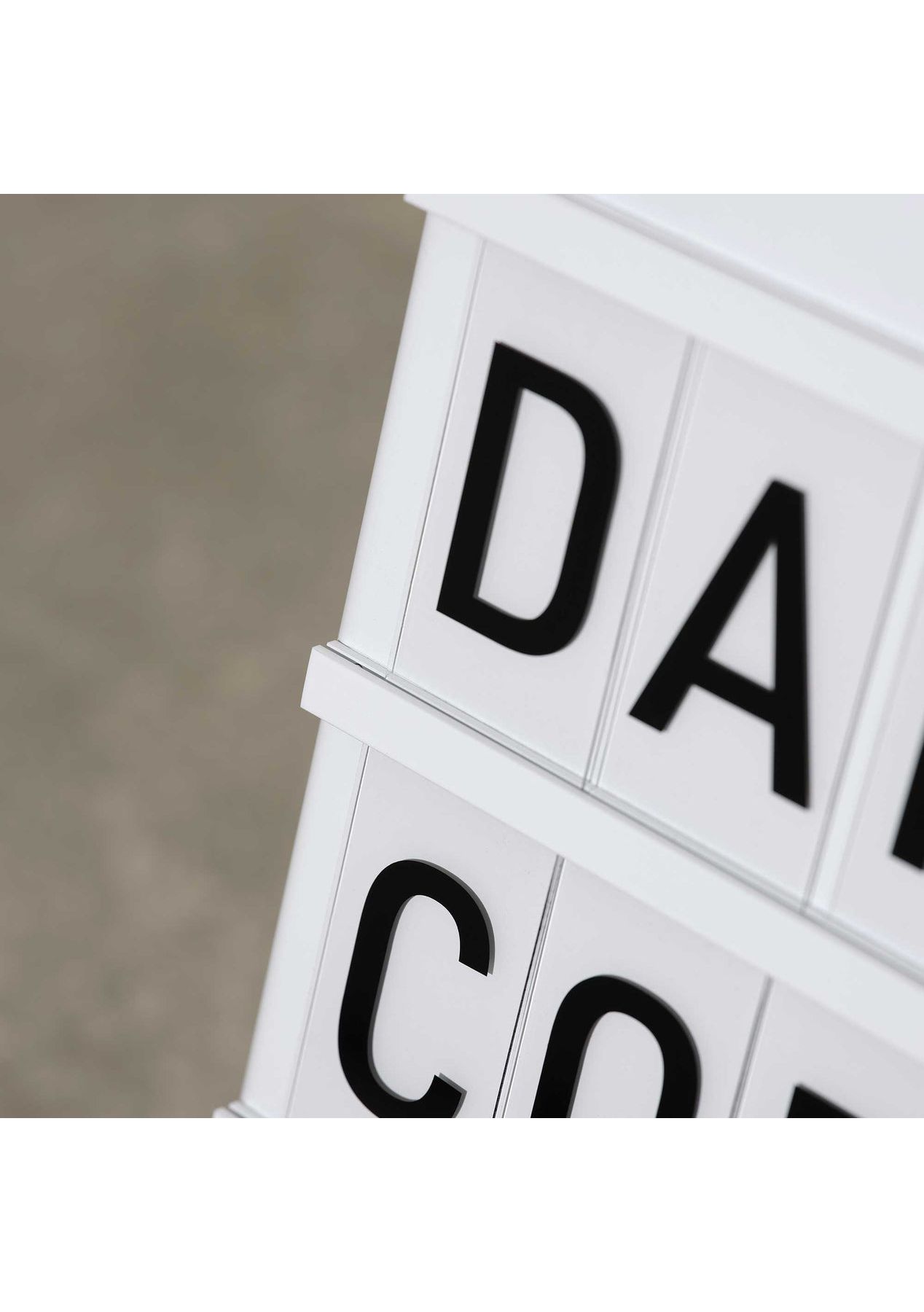 Letter Sidewalk Sign White Letters A metal sandwich board that speaks to your customers. The changeable lettering system makes changing your message easy & tidy. Please note: This sign is not compatible with magnets. Specifications Sign Dimensions: 45cm (W) x 67cm (H) Materials: Aluminium, Teak, Acrylic Weight: 5 kgs Branding area between the handle gap and top rail: 22.5cm (H) x 45cm (W) - Includes 1x pack of 218 letters, numbers & symbols - Suitable for outdoor use