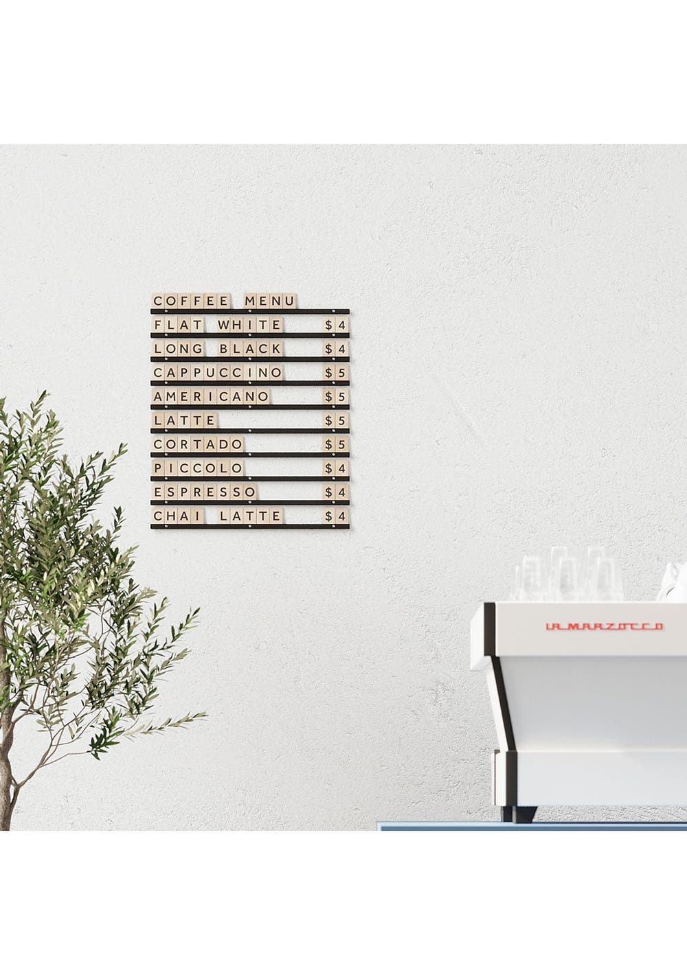 Small Wooden Letter Board White Rails White Tiles The Small Wooden Letter Board display is a menu designed to change as you do. Individual rails and interchangeable wooden letters make it easy to update what’s on offer. This all-wood letter board will bring a modern and elegant touch to your restaurant or coffee shop. Designed for smaller spaces. Specifications Rail Length: 50cm Tiles: 3.2cm (L) x 4.6cm (W) Material: Aluminium, Birch Plywood Weight: 2.12kgs *Includes 10 rails and 300 letter tiles. Suitable for indoor use only.