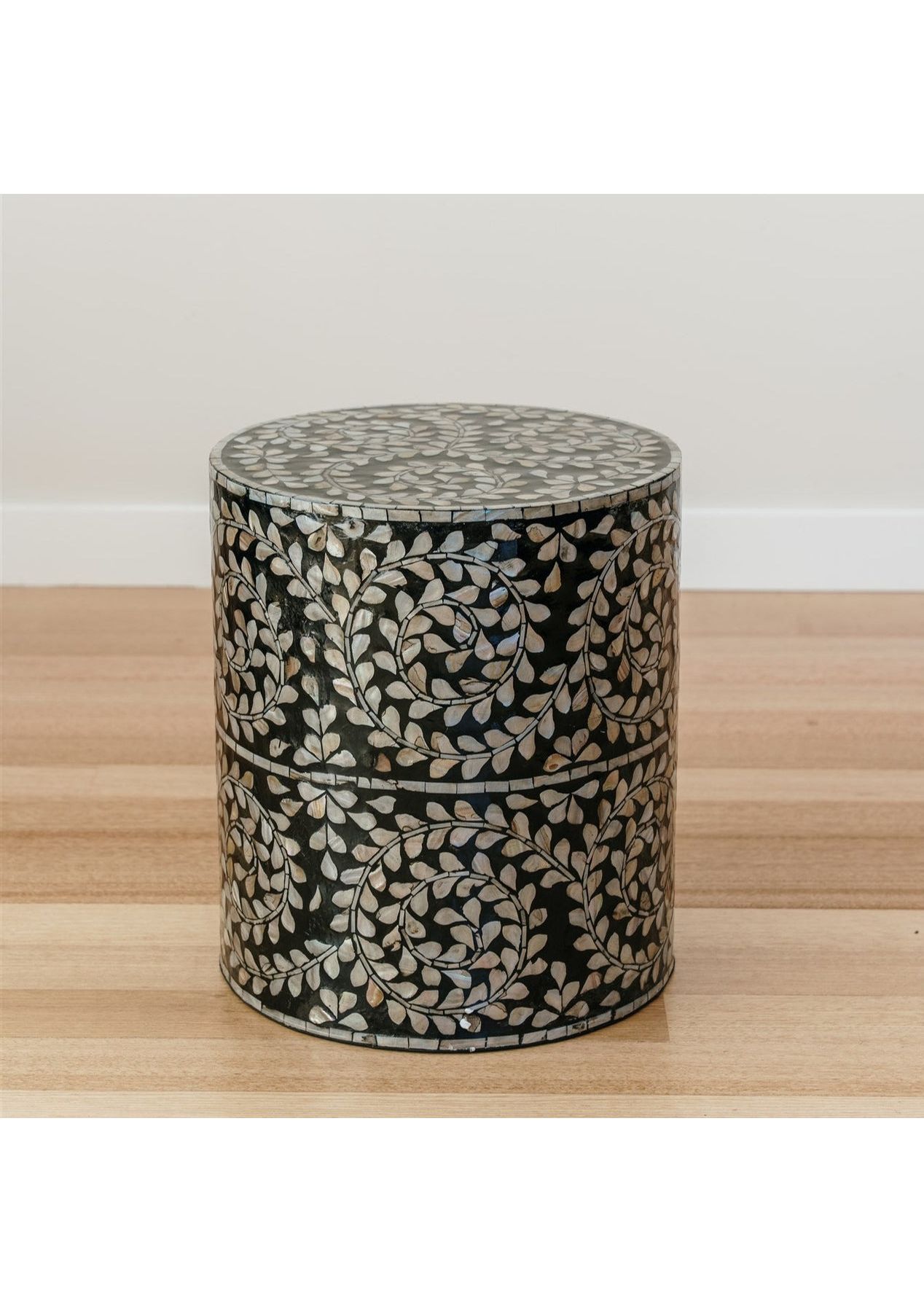 Includes: One Mother of Pearl Inlay Side Table with no assembly required. Complete the set with the Amelia Table - sold separately. Unlike traditional inlay niture our Mother of Pearl Inlay range is crafted from sustainably harvested shells in a Vietnamese village. This process combines the natural beauty of the material with ethical and eco-conscious practices. All sizes are approximate. Upgrade your living space with the timeless elegance of our Mother of Pearl Inlay range. Handcrafted by Vietnamese artisans, each unique piece adds warmth and functionality to your personal style. Perfect for any room, this stunning table combines beauty, durability, and ethical craftsmanship. NOTE: We're thrilled to introduce our new inlay niture range. As this is our first shipment, some pieces have minor imperfections. To celebrate, we're offering them at a reduced price while we work on enhancing future designs. Features: Colour Black, White & Pearl Tones Size Height: 40cmDiameter: 35cm Material MDF Base with Mother of Pearl finish Product Weight 5.4kg Packaged Weight 6kg