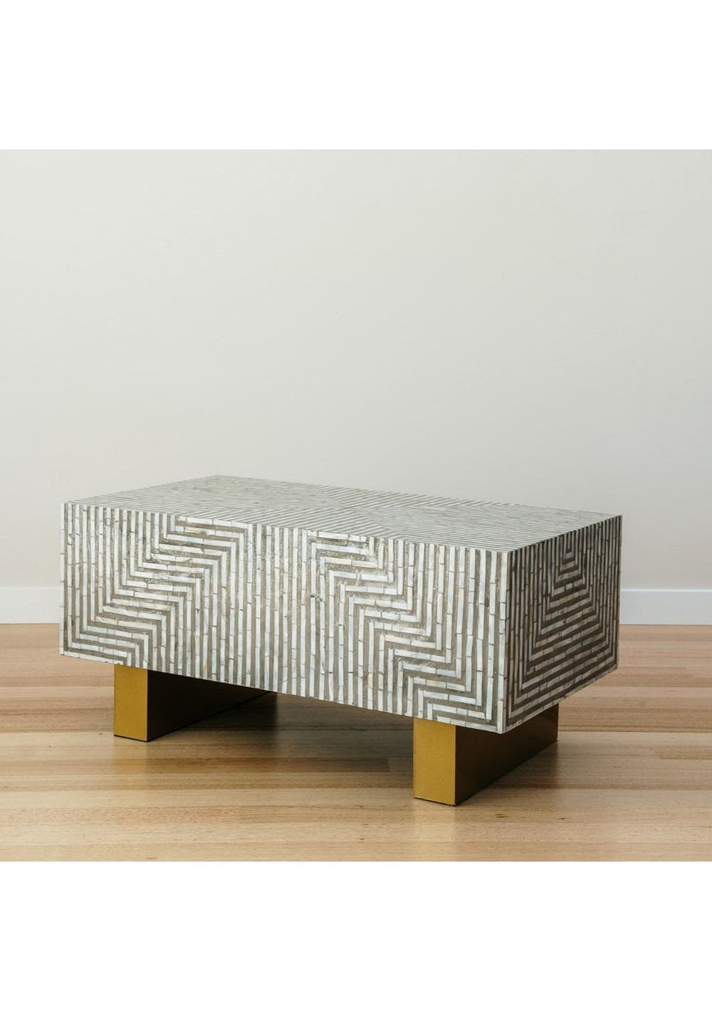 Includes: One Mother of Pearl Inlay Table. Minimal and simple assembly is required. The detailed design will complement any decor. Unlike traditional inlay niture our Mother of Pearl Inlay range is crafted with sustainably harvested shells from a Vietnamese village. This process combines the natural beauty of the material with ethical and eco-conscious practices. All sizes are approximate. Upgrade your living space with the timeless elegance of our Mother of Pearl Inlay range. Handcrafted by Vietnamese artisans, each unique piece adds warmth and functionality to your personal style. Perfect for any room, this stunning table combines beauty, durability, and ethical craftsmanship. NOTE: We're thrilled to introduce our new inlay niture range. As this is our first shipment, some pieces have minor imperfections. To celebrate, we're offering them at a reduced price while we work on enhancing future designs. Features: Colour Soft grey and pearl details with a brass toned base Size Height: 45cmWidth: 96cmDepth: 52cm Material MDF Base with mother of pearl finish Product Weight 20kg Packaged Weight 24kg