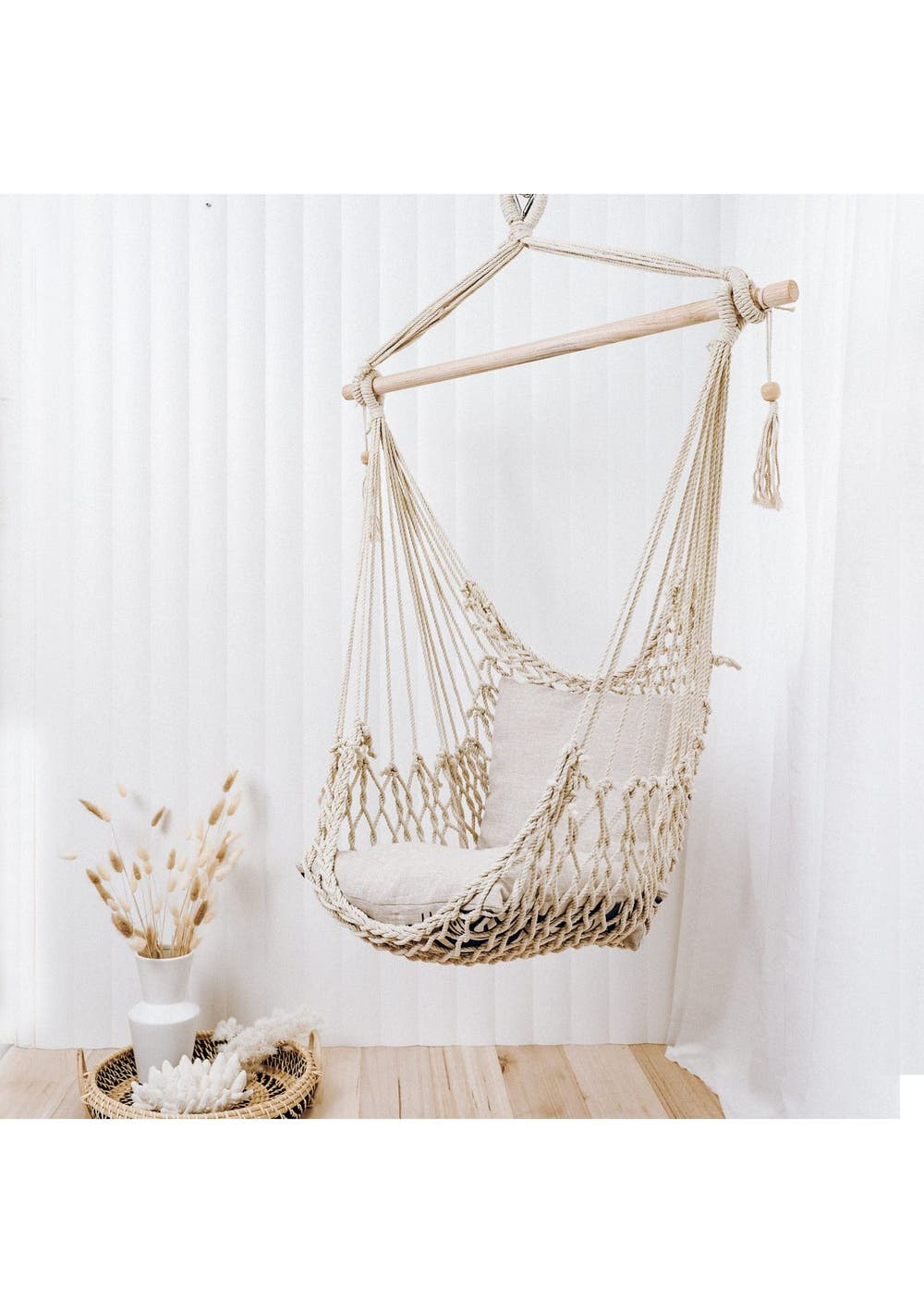 Our macrame beaded hammock chair is hand crafted to the highest quality. Create a relaxing space, choose a tree or the verandah out the back with a specially positioned weight baring "S" hook and we just know you'll have a good time. Setup is as easy as installing a screw hook into a wooden beam, attaching a tree strap to a strong branch, or hanging it from a stand. Hanging kit sold separately.Need help hanging your new hammock chair? Click Here Features: Brand Ivory & Deene Style Salvador Colour Natural Size 180cm x 120cm Included Hammock + Wooden Rod + Top Rope Detail Fabric Cotton Blend Maximum Weight 120kg Notes - Sturdy ropes and wooden rod.- Hang it in your backyard, patio or courtyard by its O ring. - Approximate weight of 1.7 kg