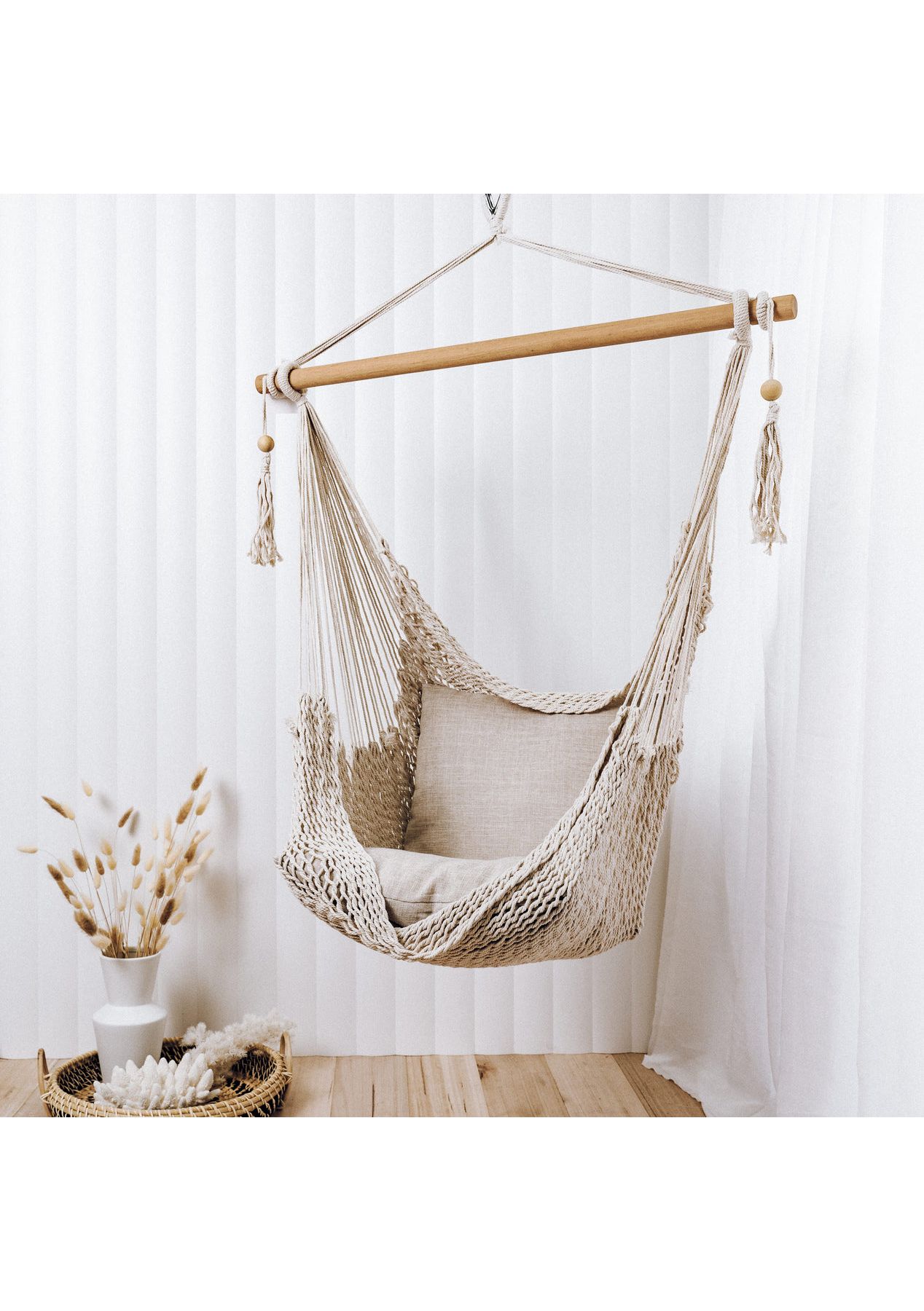 Our macrame beaded hammock chair is hand crafted to the highest quality. Create a relaxing space, choose a tree or the verandah out the back with a specially positioned weight baring "S" hook and we just know you'll have a good time. Setup is as easy as installing a screw hook into a wooden beam, attaching a tree strap to a strong branch, or hanging it from a stand. Hanging kit sold separately.Need help hanging your new hammock chair? Click Here Features: Brand Ivory & Deene Style Havana Colour Cream Size 120cm x 90cm Included Hammock + Wooden Rod + Top Rope Detail Fabric Cotton Blend Maximum Weight 120kg Notes - Sturdy ropes and wooden rod.- Hang it in your backyard, patio or courtyard by its O ring. - Approximate weight of 1.8 kg- Cushions and accessories are not included.