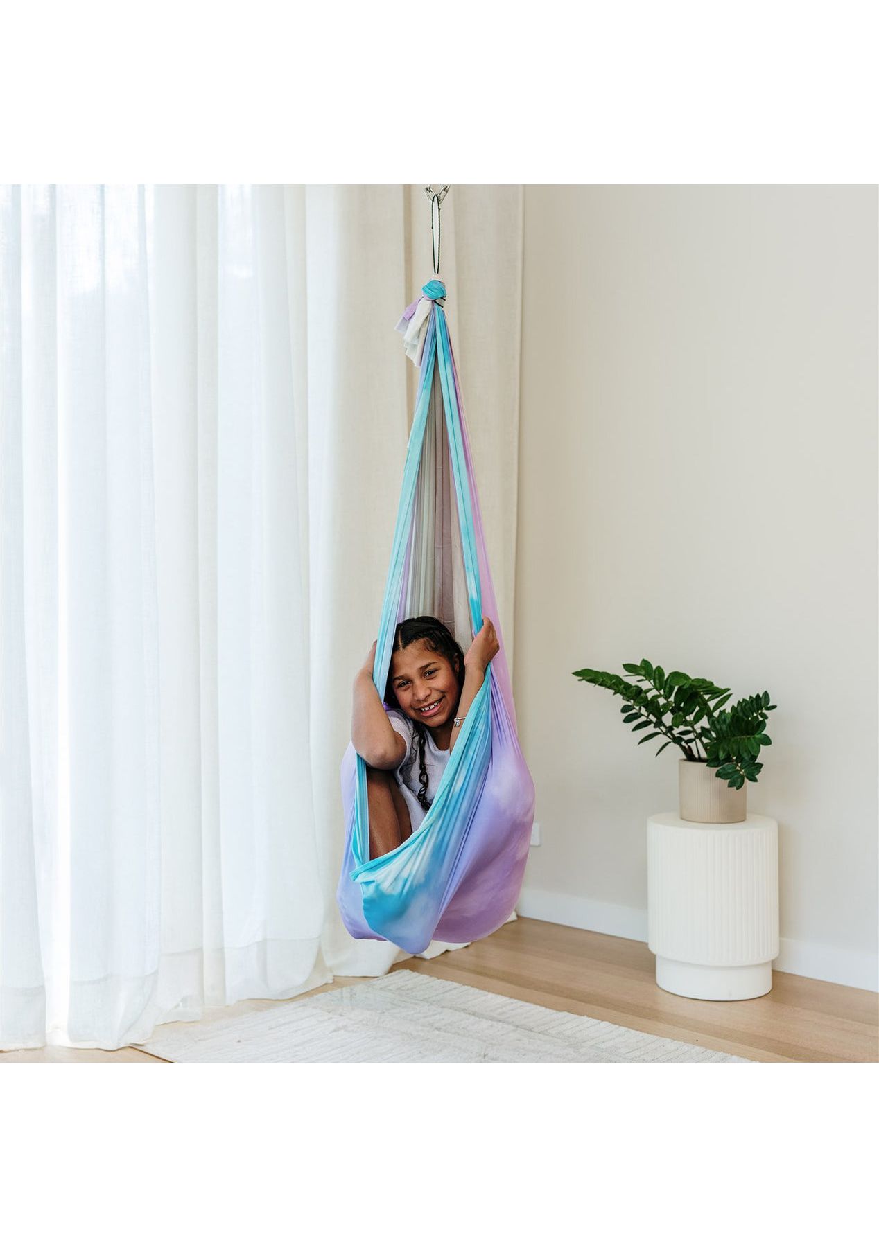Create fun indoor and outdoor play areas for your kids in minutes with this hammock swing. It can be easily hung from a tree or attached to an indoor roof with no complex parts required. Enjoy stress-free installation and more entertainment for your kids. Cosy Cocoon therapy swings aid in the development of children's motor skills and core strength while providing sensory stimulation. They are perfectly designed for children with sensory issues like ADD, ADHD and autism, and these swings also help improve mood and well-being, creating a soothing and sensory-friendly environment for them to adjust to. It is easy to install and comes complete with hanging kit and instructions. Features: Brand Ivory & Deene Style Cosy Cocoon Colour Tye Die Rainbow Size 280cmx150cm Included 1 Cosy Cocoon in Fabric Bag1 x O-Sling1x Carabiner1x 1meter strap1x Fixed Plate including 4pc screws Fabric Polyester Maximum Weight 80kg